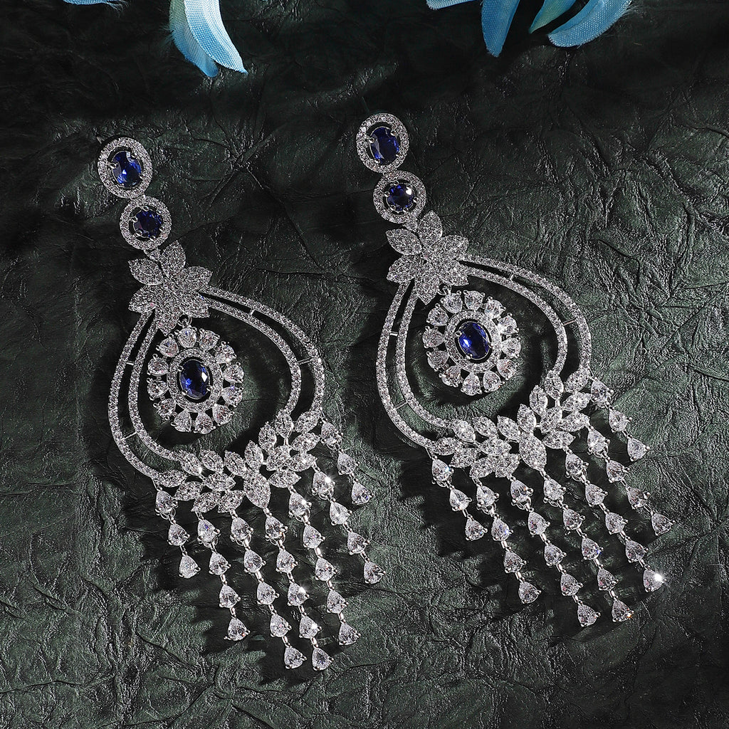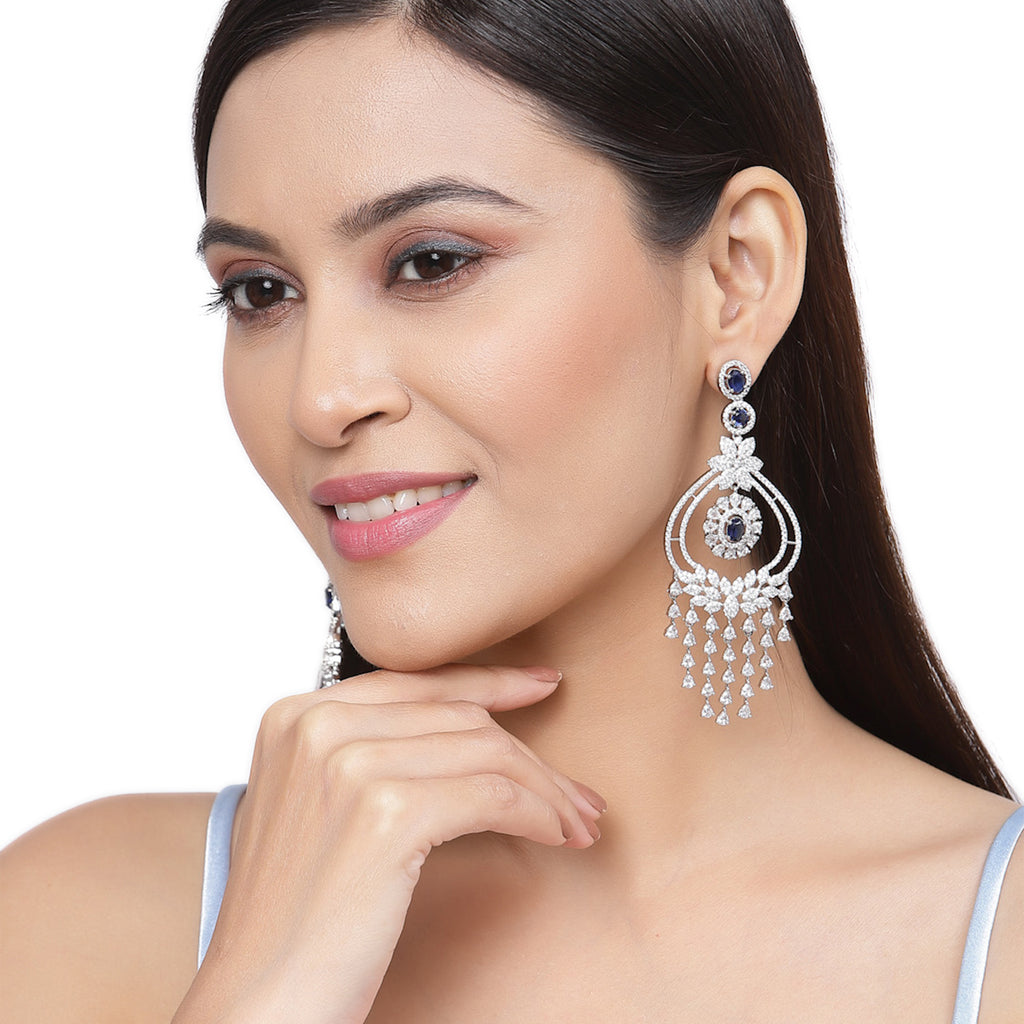 Rhodium-Plated Navy Blue & White American Diamond studded Quirky Shaped Drop Earrings