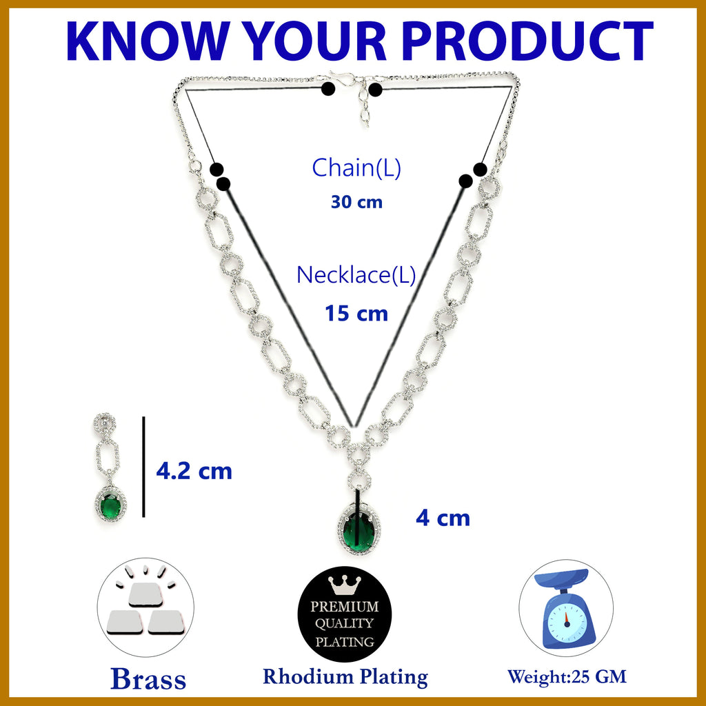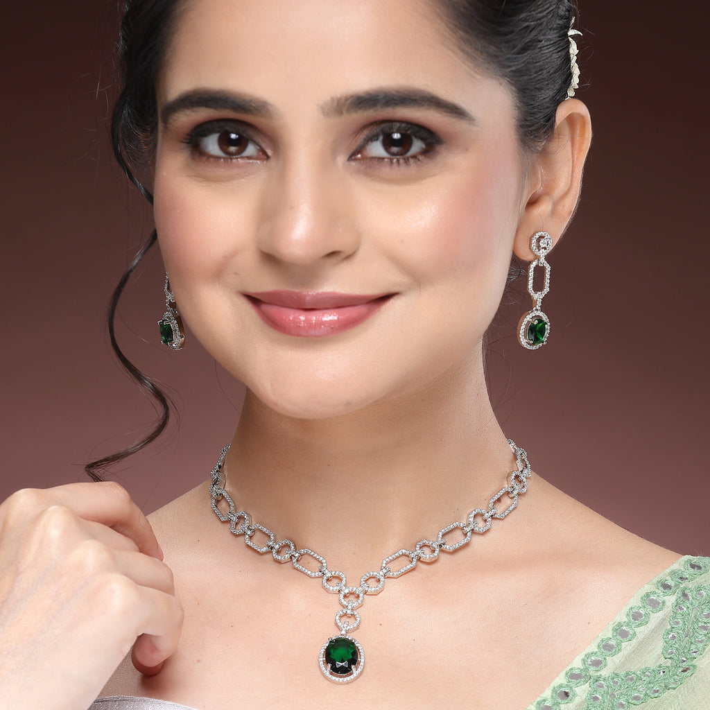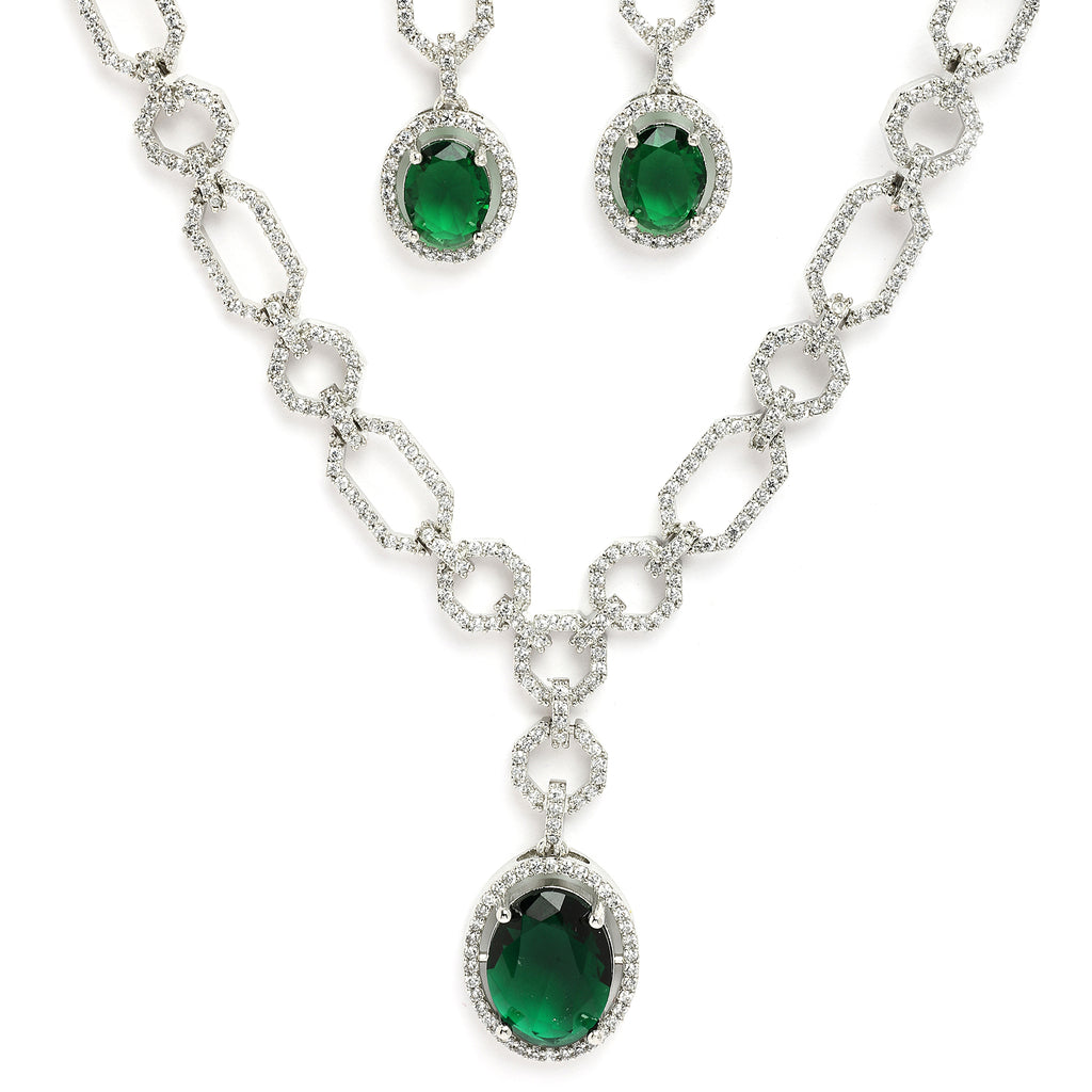 Elegant Design: Rhodium-plated necklace set featuring the sophisticated Emerald Dreams design with green American diamonds.