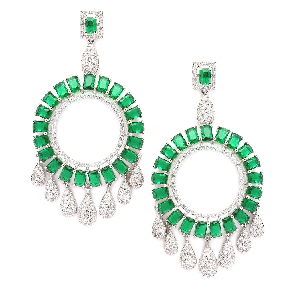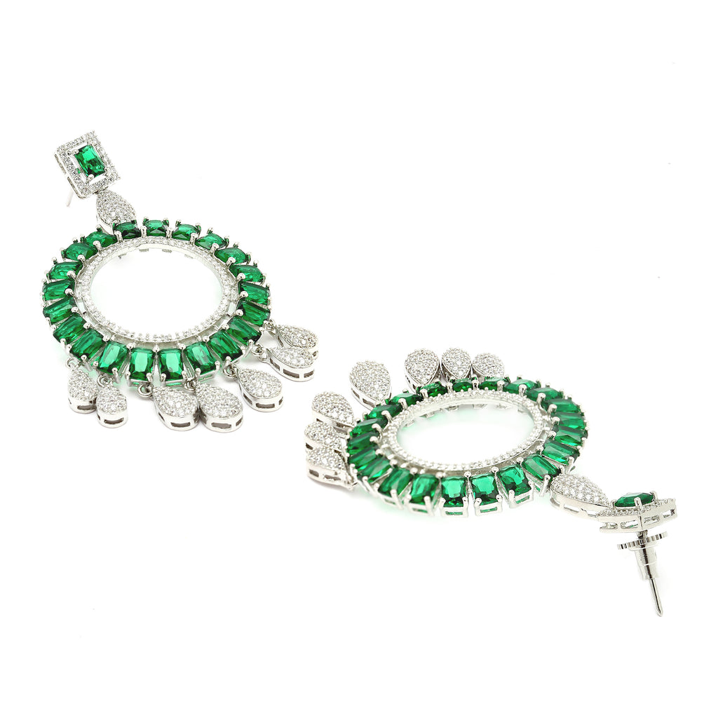 Rhodium-Plated Green American Diamond studded Circular Shape Dangle Earrings