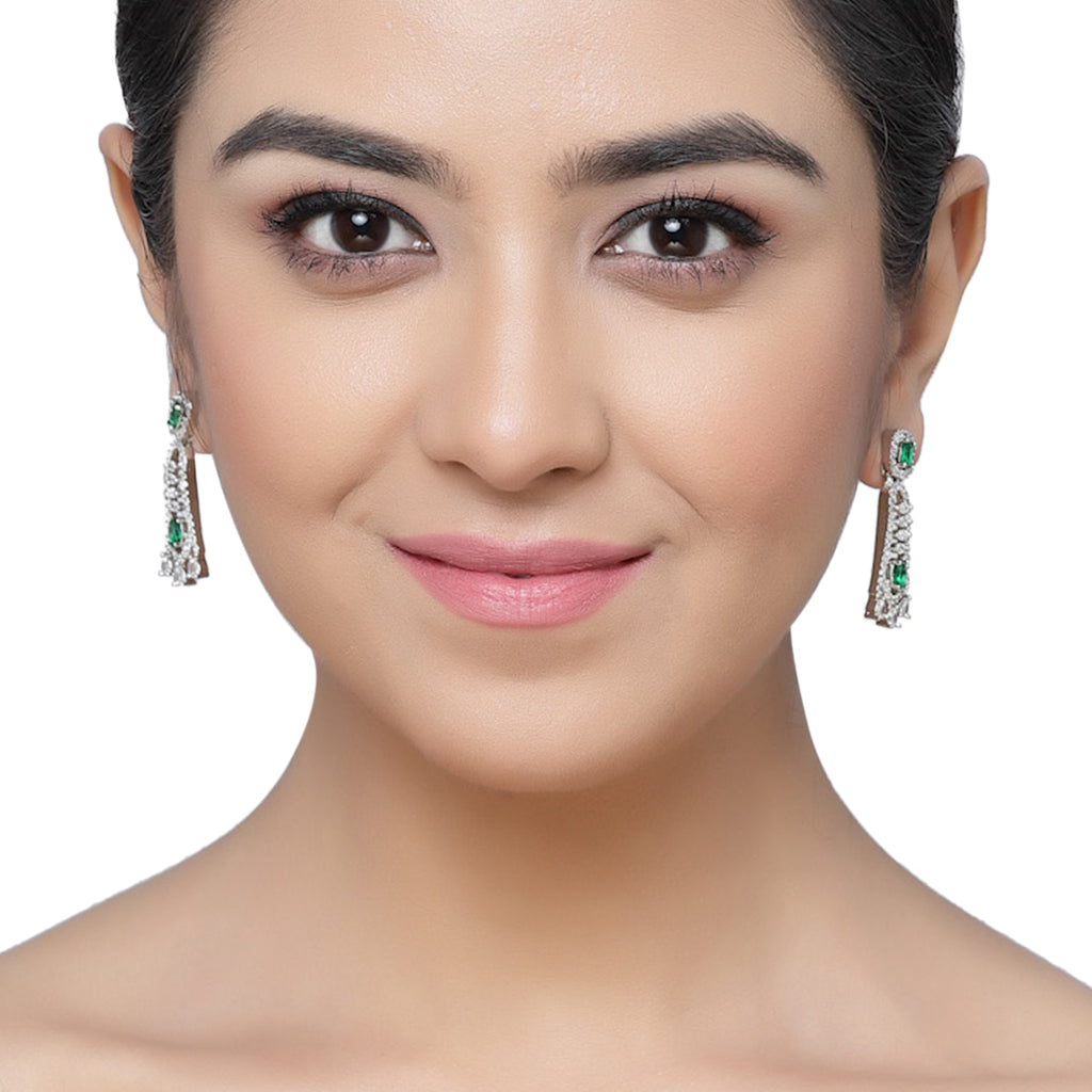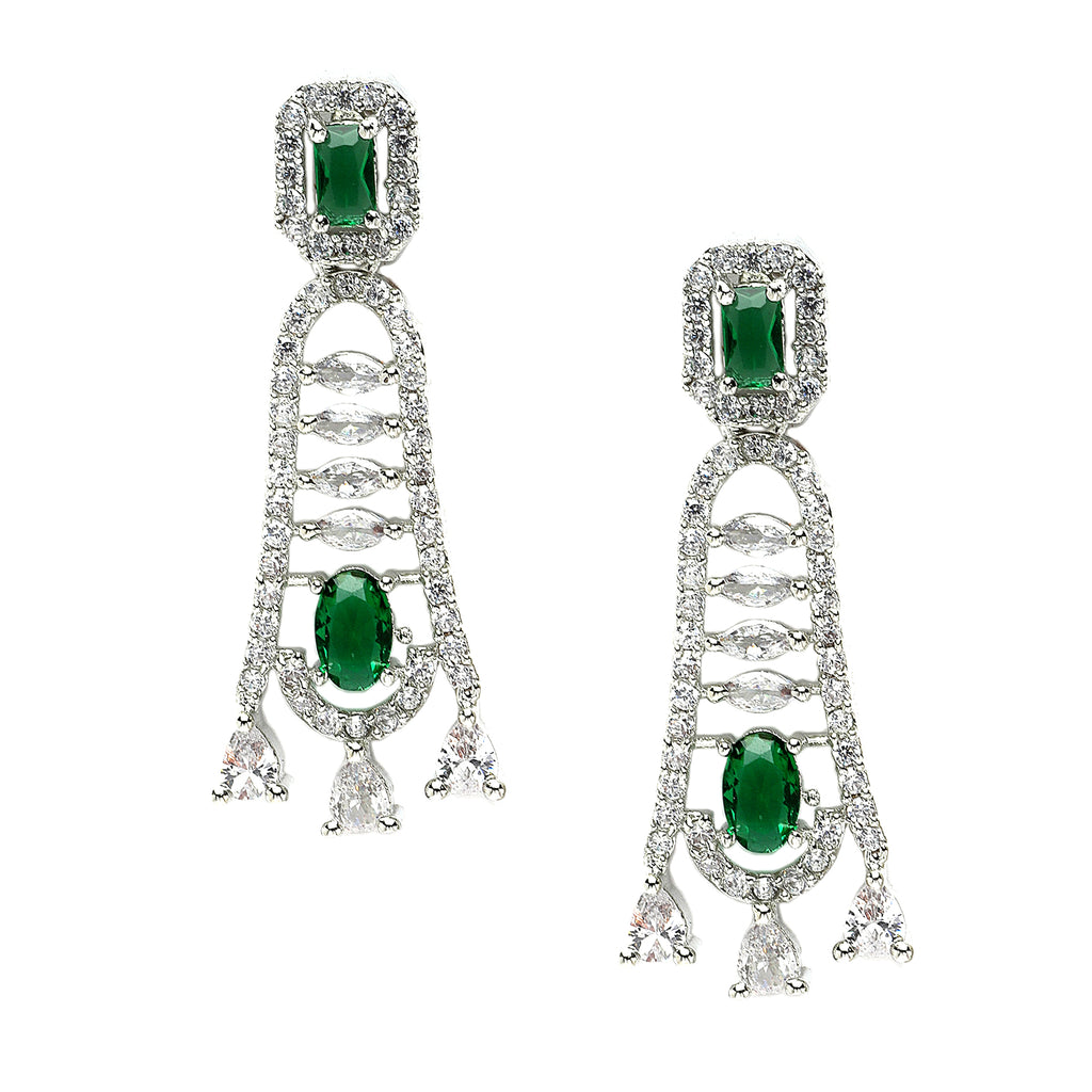 Rhodium-Plated Green American Diamond studded Classic Contemporary Drop Earrings