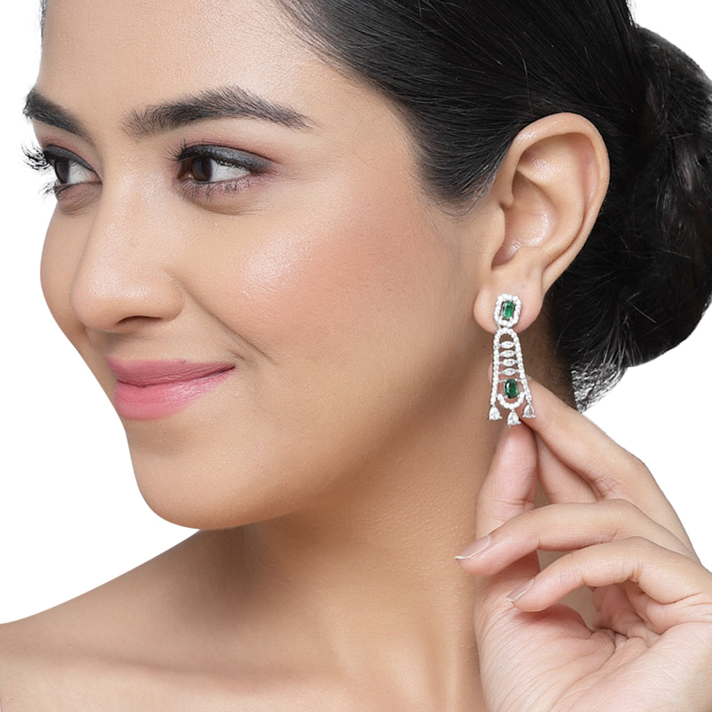 Rhodium-Plated with Silver-Toned Green and White Contemporary Drop Earrings, has American Diamond studded secured with a post and back.