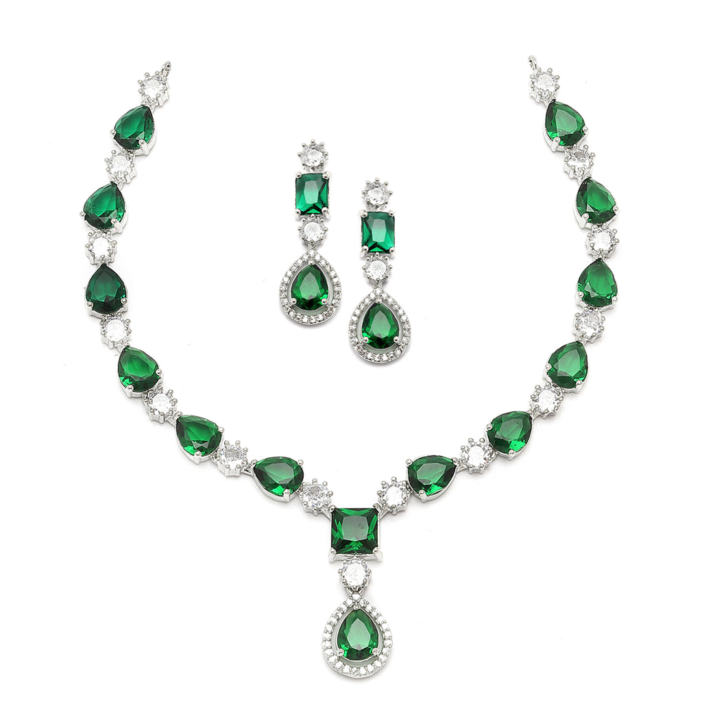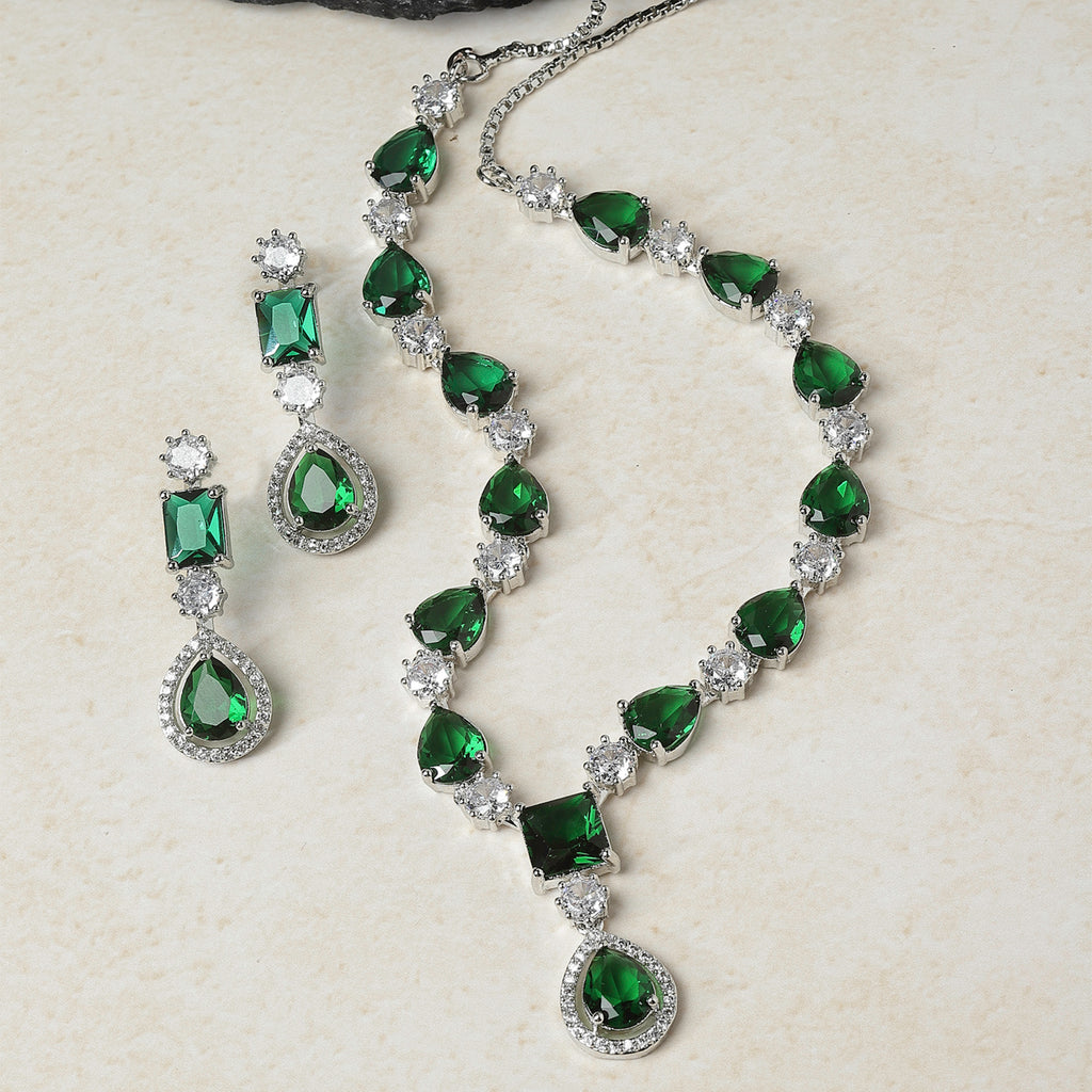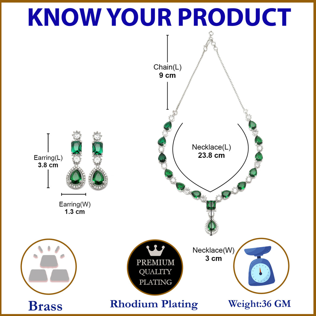 Rhodium-Plated Green American Diamond Studded Fashionable Necklace & Earrings Jewellery Set