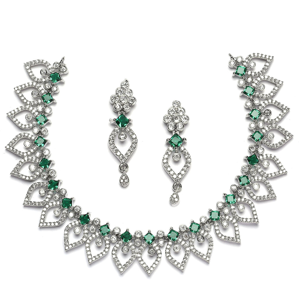 Rhodium-Plated Green American Diamond Studded Floral & Leaf Shaped Necklace with Earrings Jewellery Set