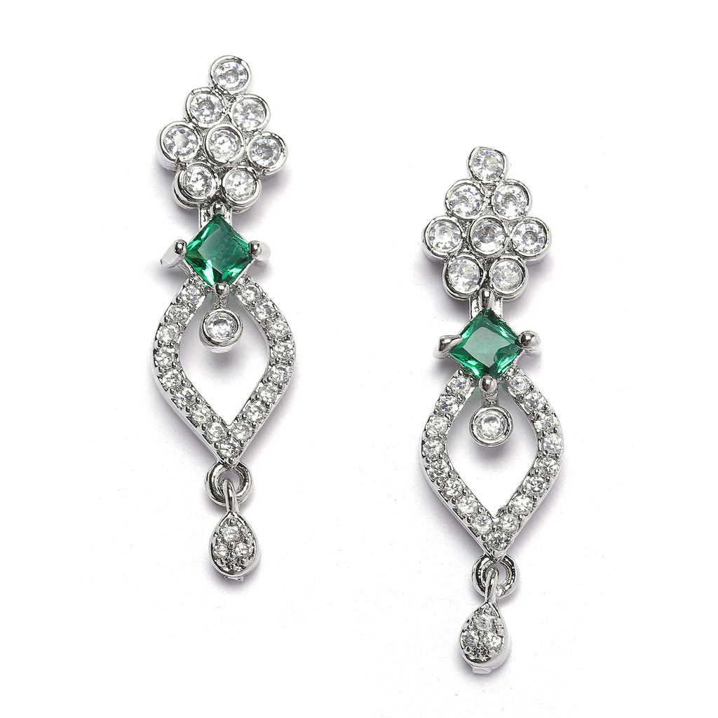 This jewellery set consists of a necklace and a pair of earrings. Rhodium-Plated green & white american diamond studded floral & leaf shaped necklace, has secured with a hook closure. A pair of matching drop earrings, each secured with a post and back closure.