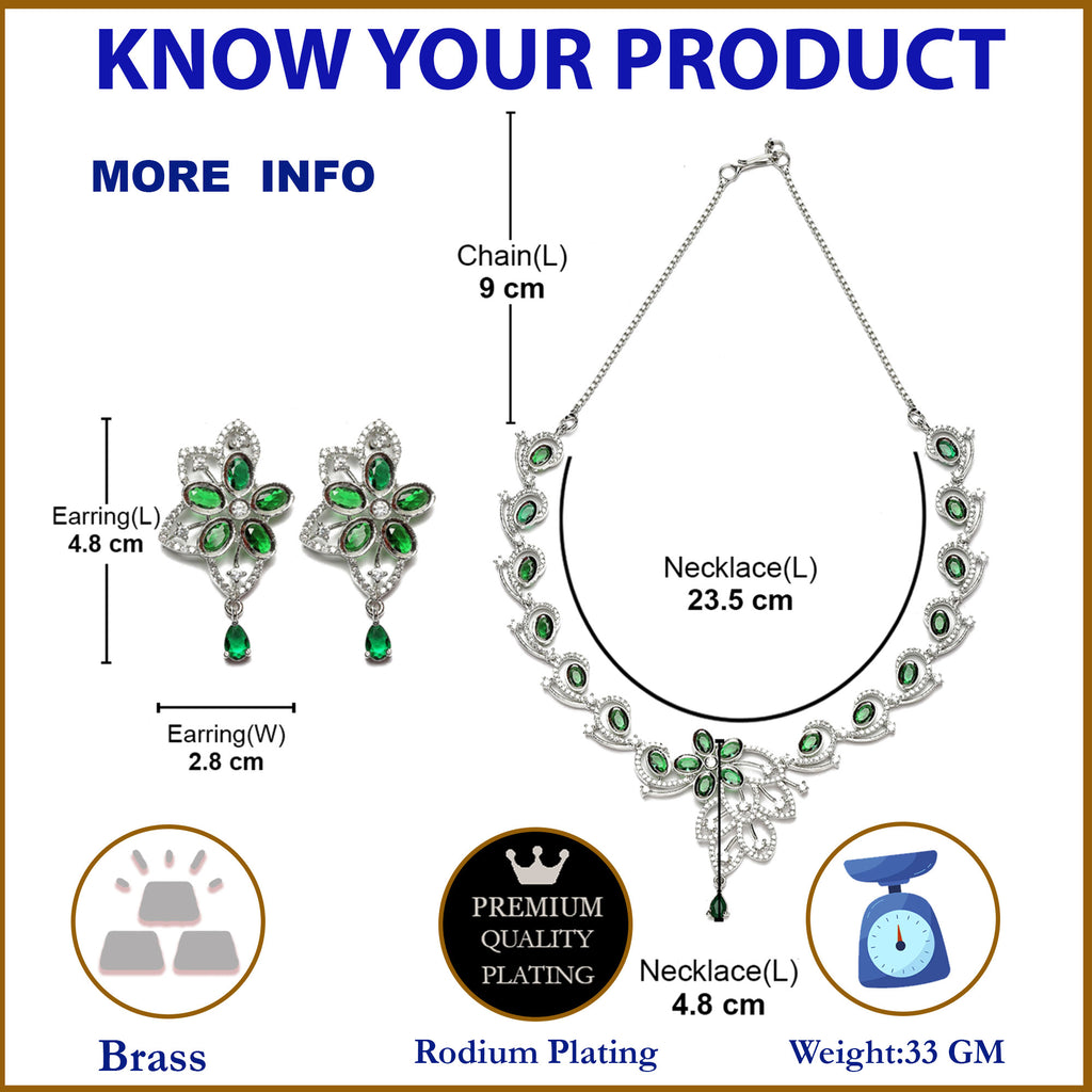 Rhodium-Plated Green American Diamond Studded Floral & Paisley Shaped Necklace with Earrings Jewellery Set