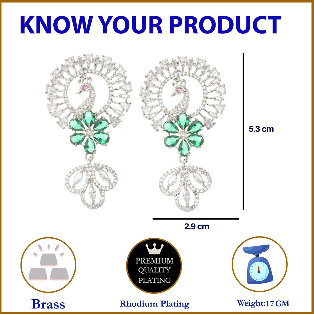 Rhodium-Plated Green American Diamond studded Handcrafted Peacock Shaped Drop Earrings
