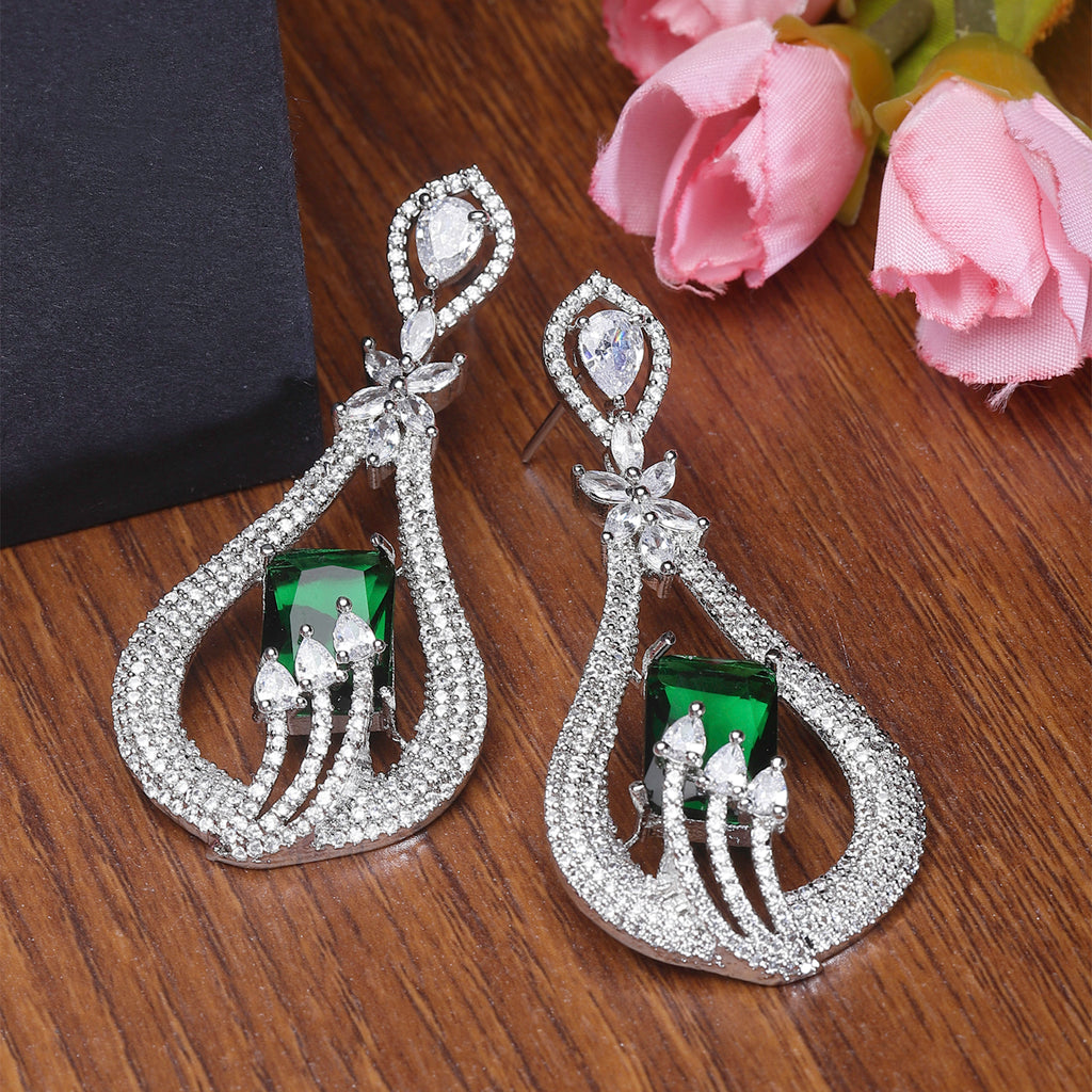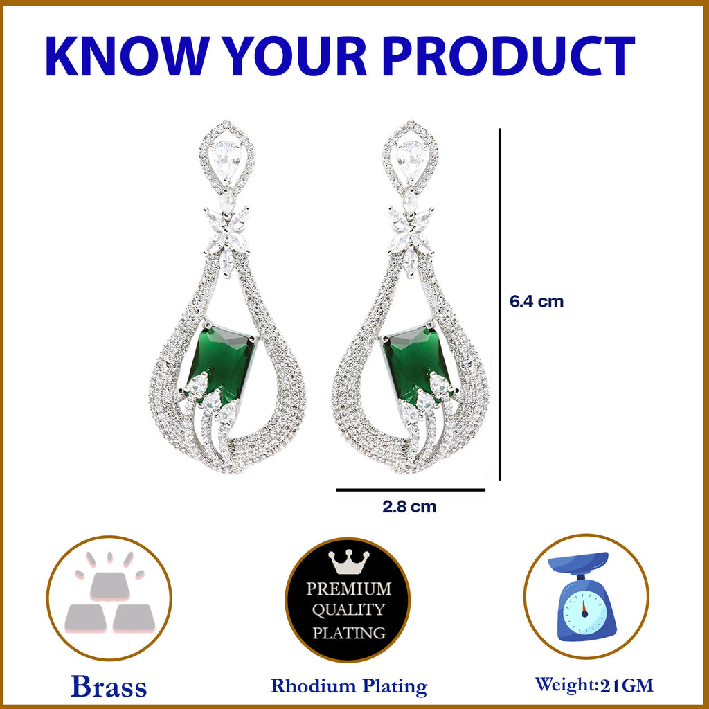 Rhodium-Plated Green American Diamond studded Handcrafted Quirky Shaped Drop Earrings