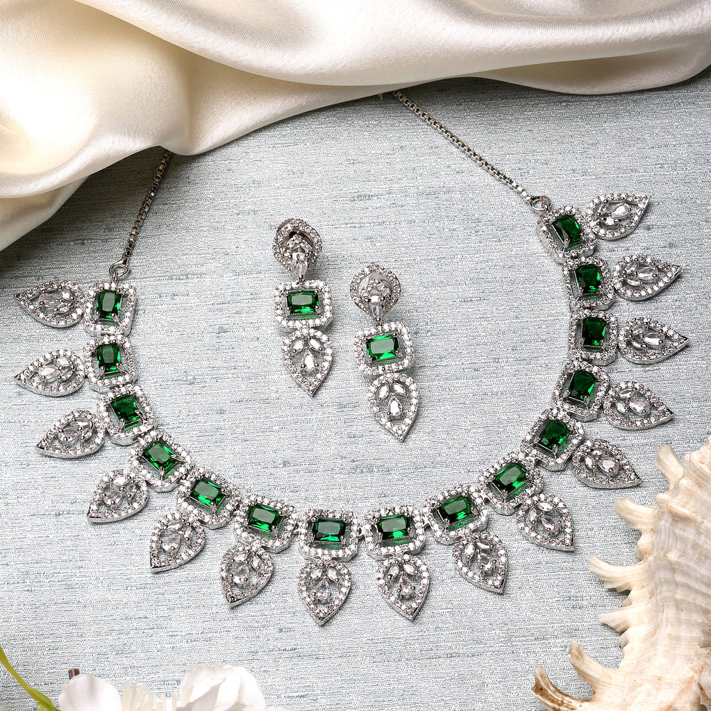 Rhodium-Plated Green American Diamond Studded Leaf Shaped Necklace with Earrings Jewellery Set