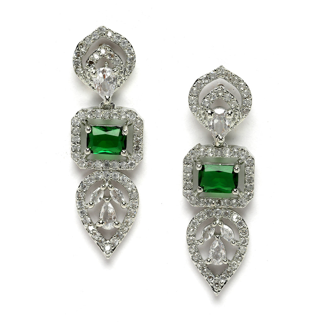 This jewellery set consists of a necklace and a pair of earrings. Rhodium-Plated green and white american diamond studded leaf shaped collar necklace, has secured with a hook closure. A pair of matching drop earrings, each secured with a post and back closure.