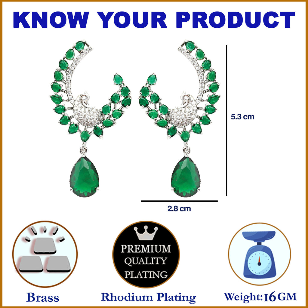 Rhodium-Plated Green American Diamond studded Peacock & Feather Shaped Drop Earrings