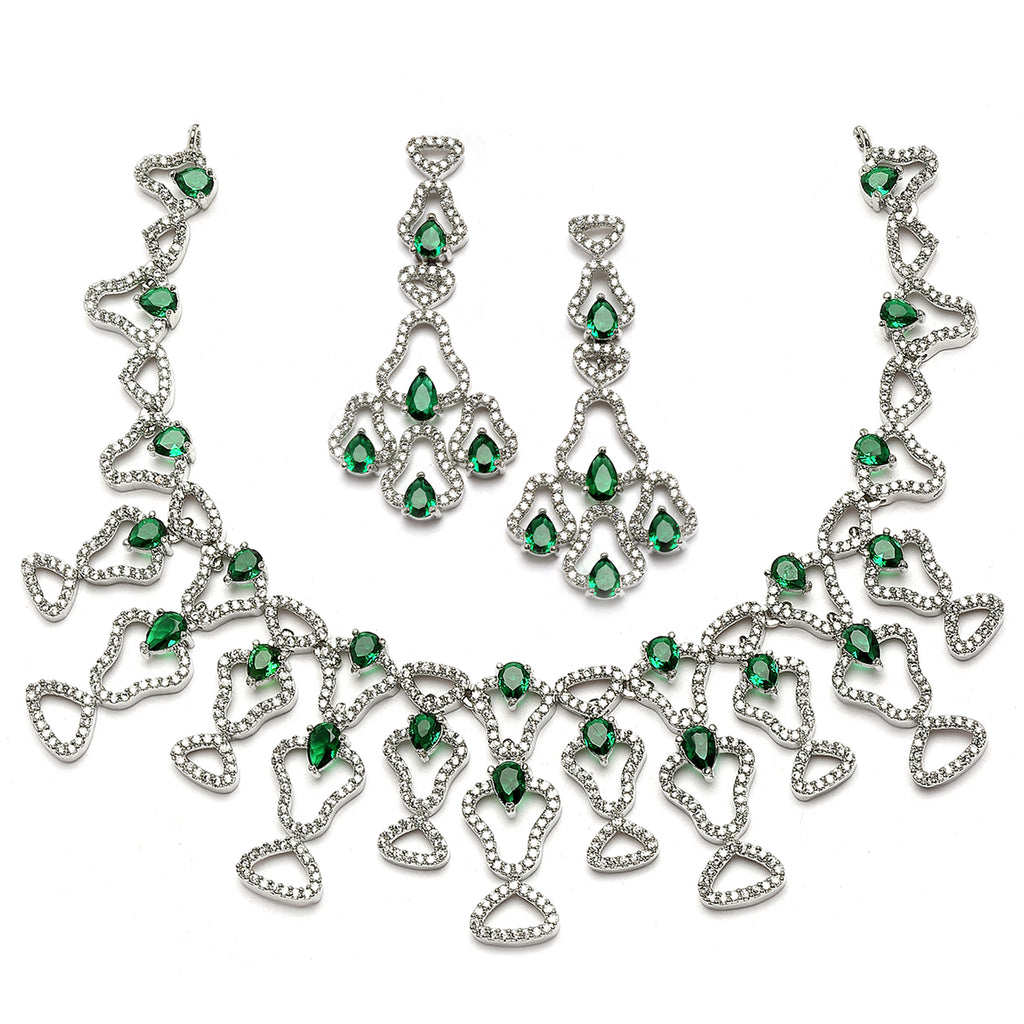Rhodium-Plated Green American Diamond Studded Quirky Design Necklace with Earrings Jewellery Set