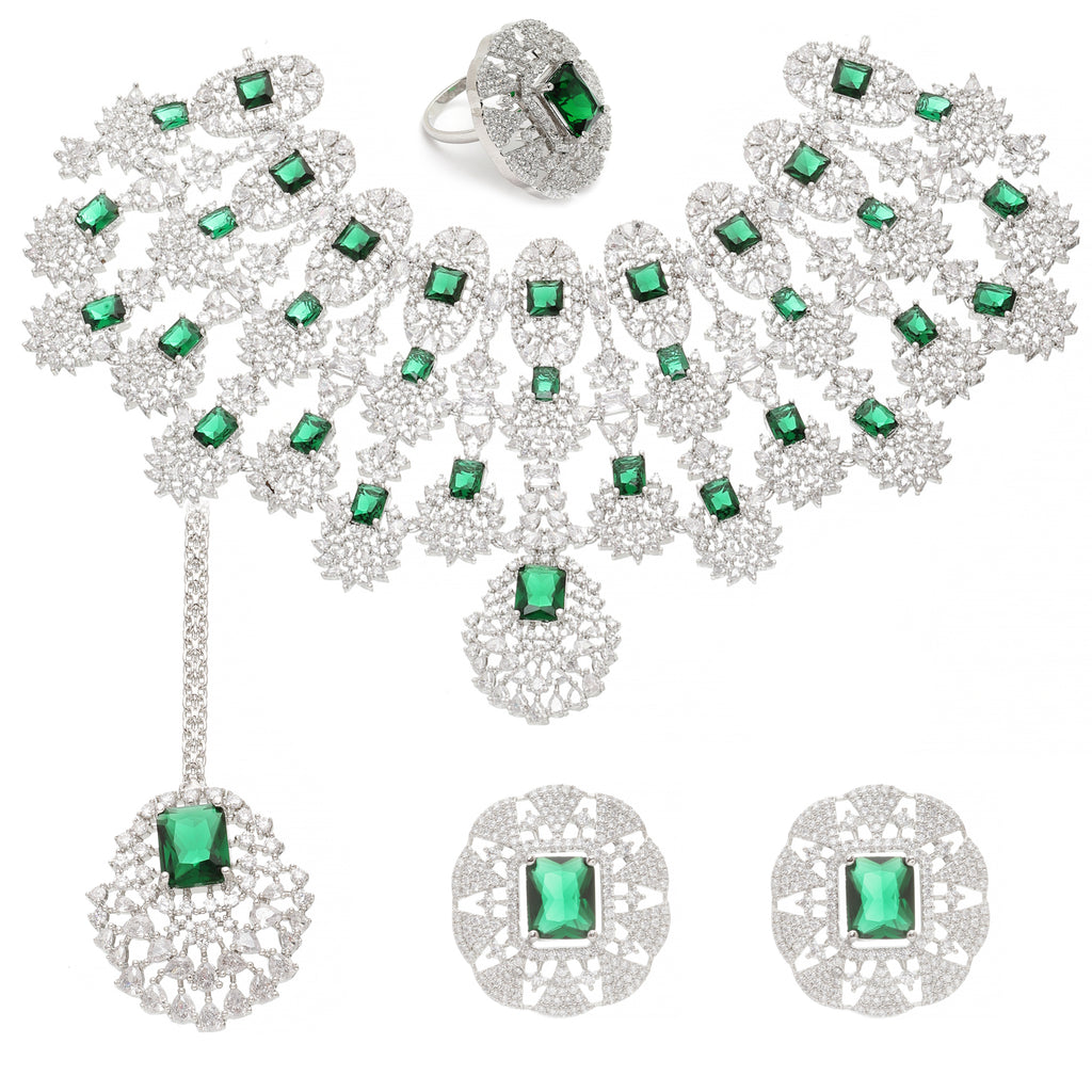 This jewellery set consists of a necklace, a pair of earrings, a ring and a maangtikka. Rhodium-Plated green & white american diamond studded tasselled necklace, has secured with a hook closure. A pair of matching stud earrings, each secured with a post and back closure. A mataching ring, secured with adjustable closure. A matching maangtikka, secured with hook closure.
