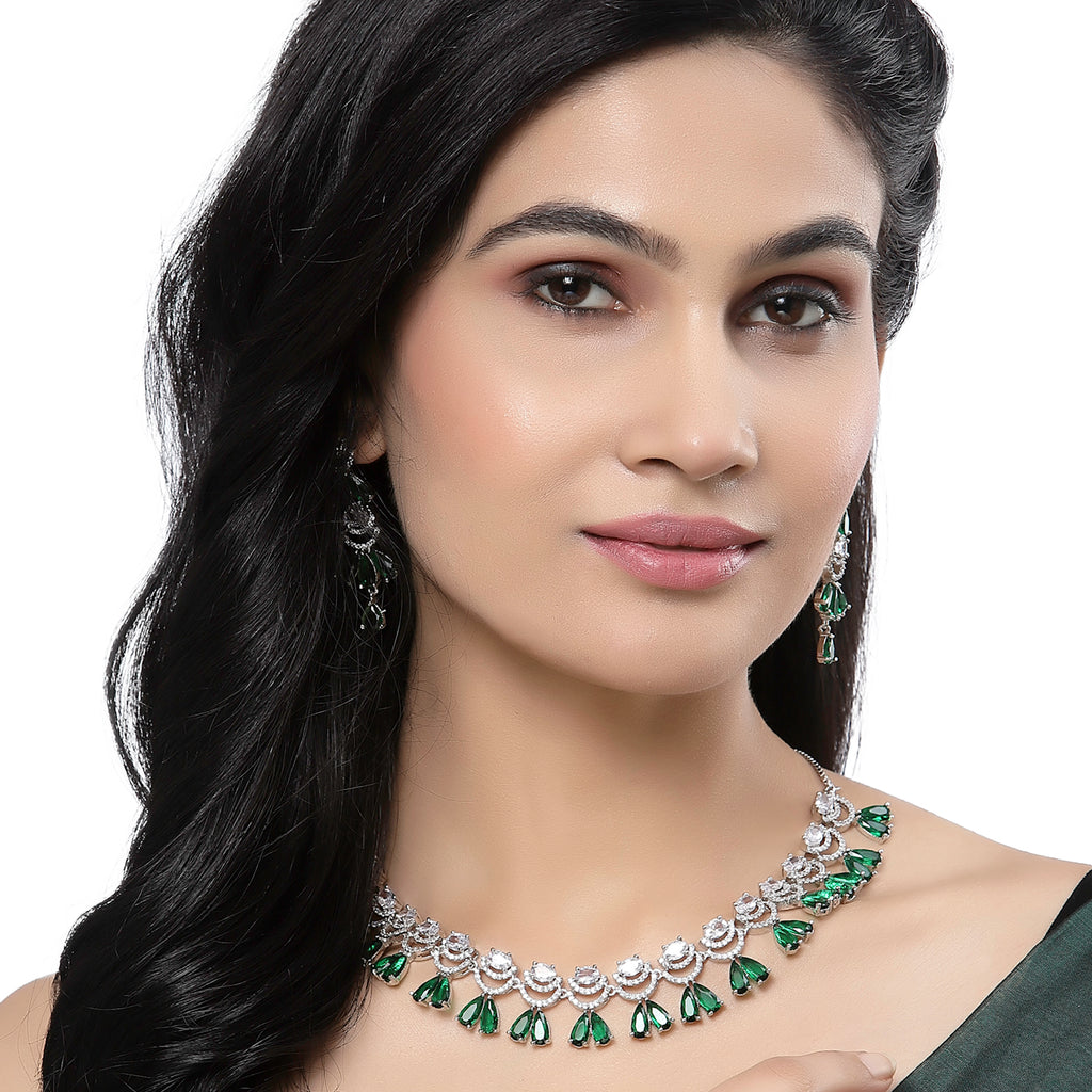 Rhodium-Plated Green American Diamond Studded Teardrop & Crescent Shaped Necklace with Earrings Jewellery Set