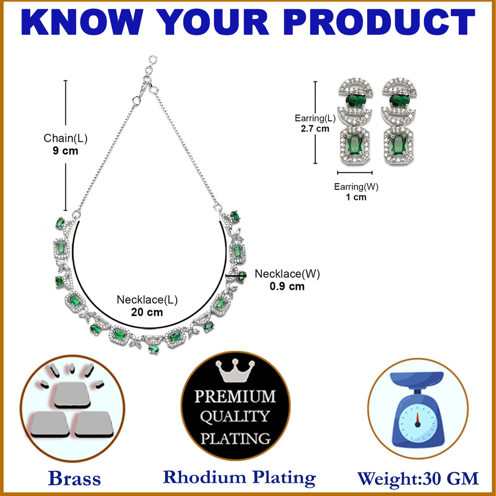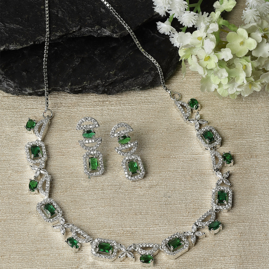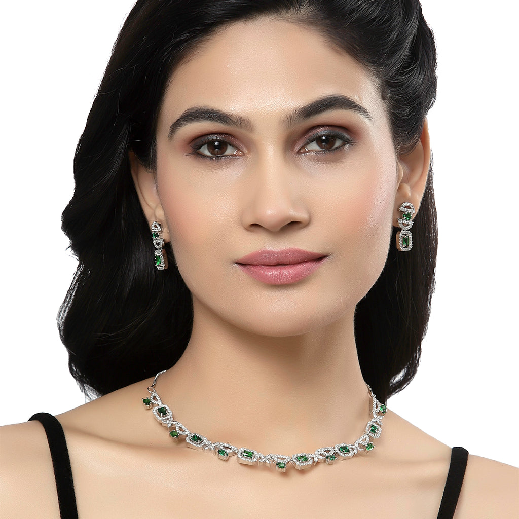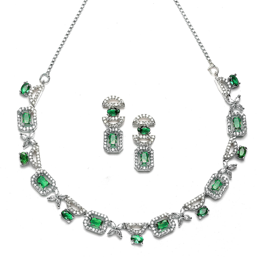 Rhodium-Plated Green American Diamonds Studded Boxy Necklace & Earrings Jewellery Set