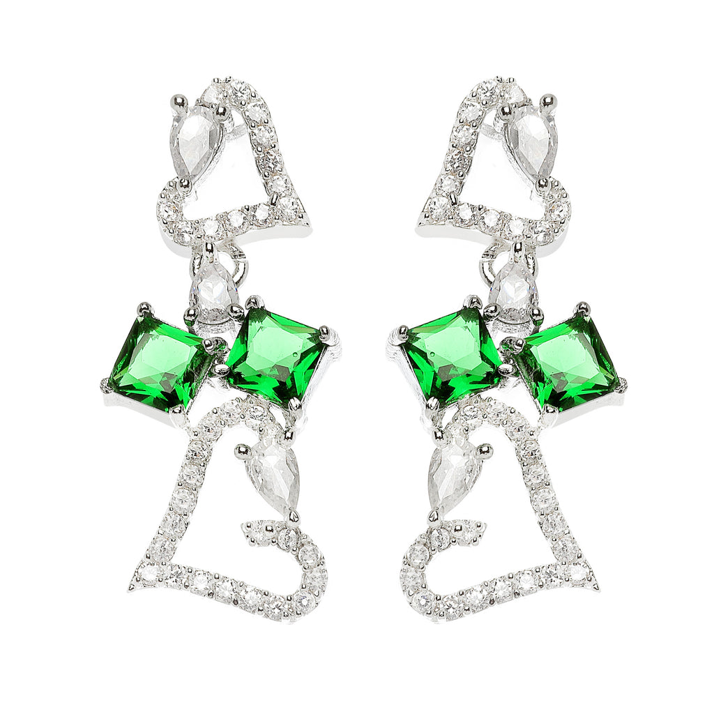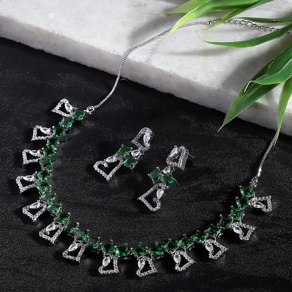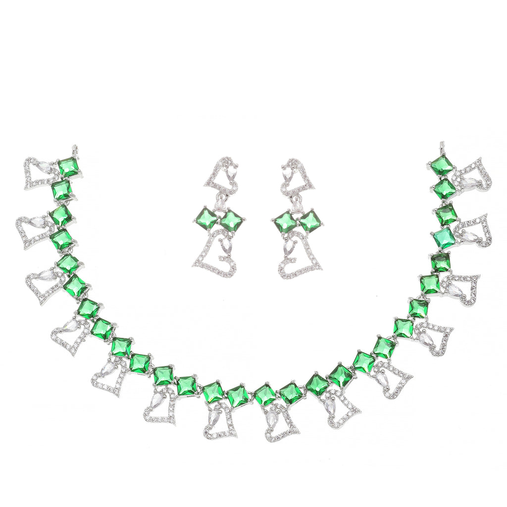 Rhodium-Plated Green American Diamonds Studded Cordate Necklace & Earrings Jewellery Set
