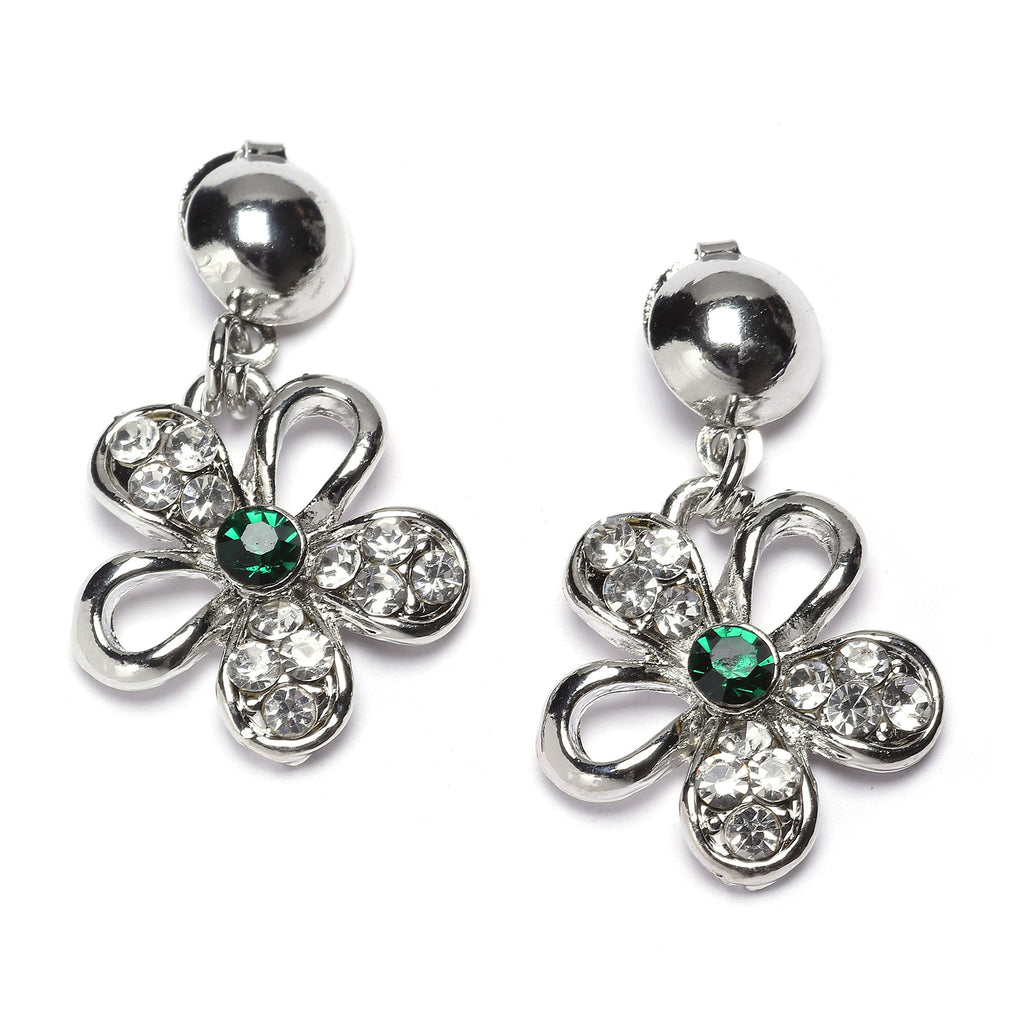 Rhodium-Plated Green American Diamonds Studded Floweret Necklace & Earrings Jewellery Set