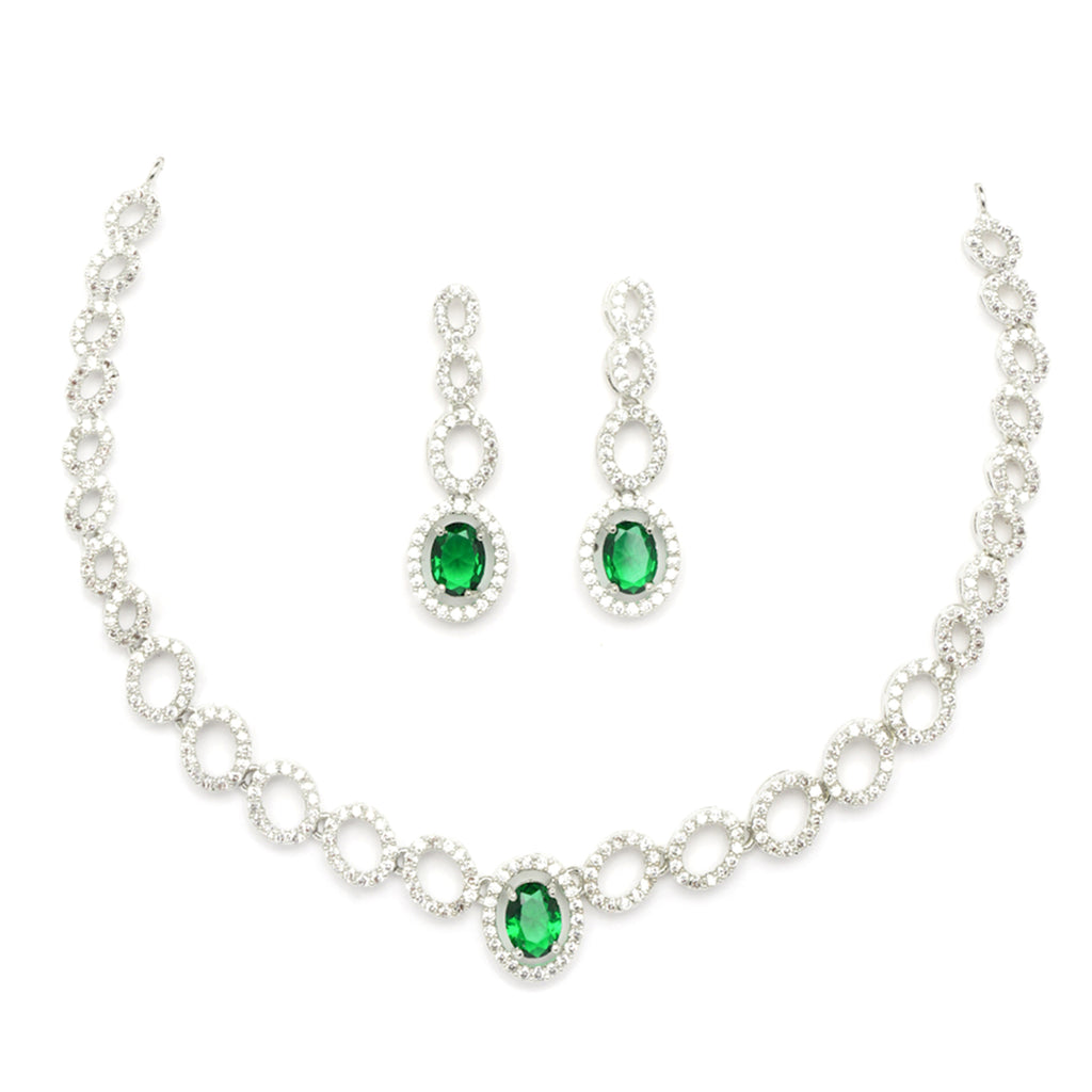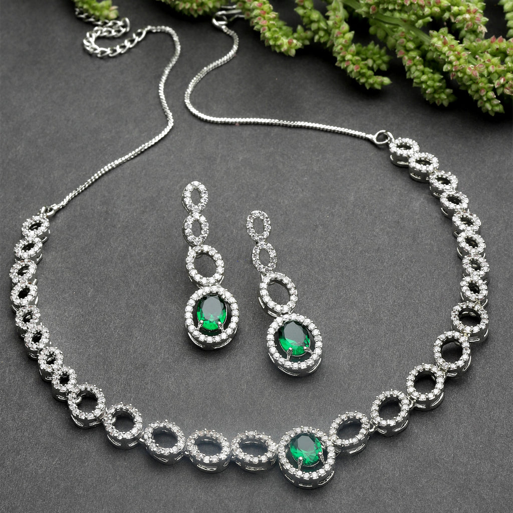 Rhodium-Plated Green American Diamonds Studded Ovate Shaped Necklace & Earrings Jewellery Set