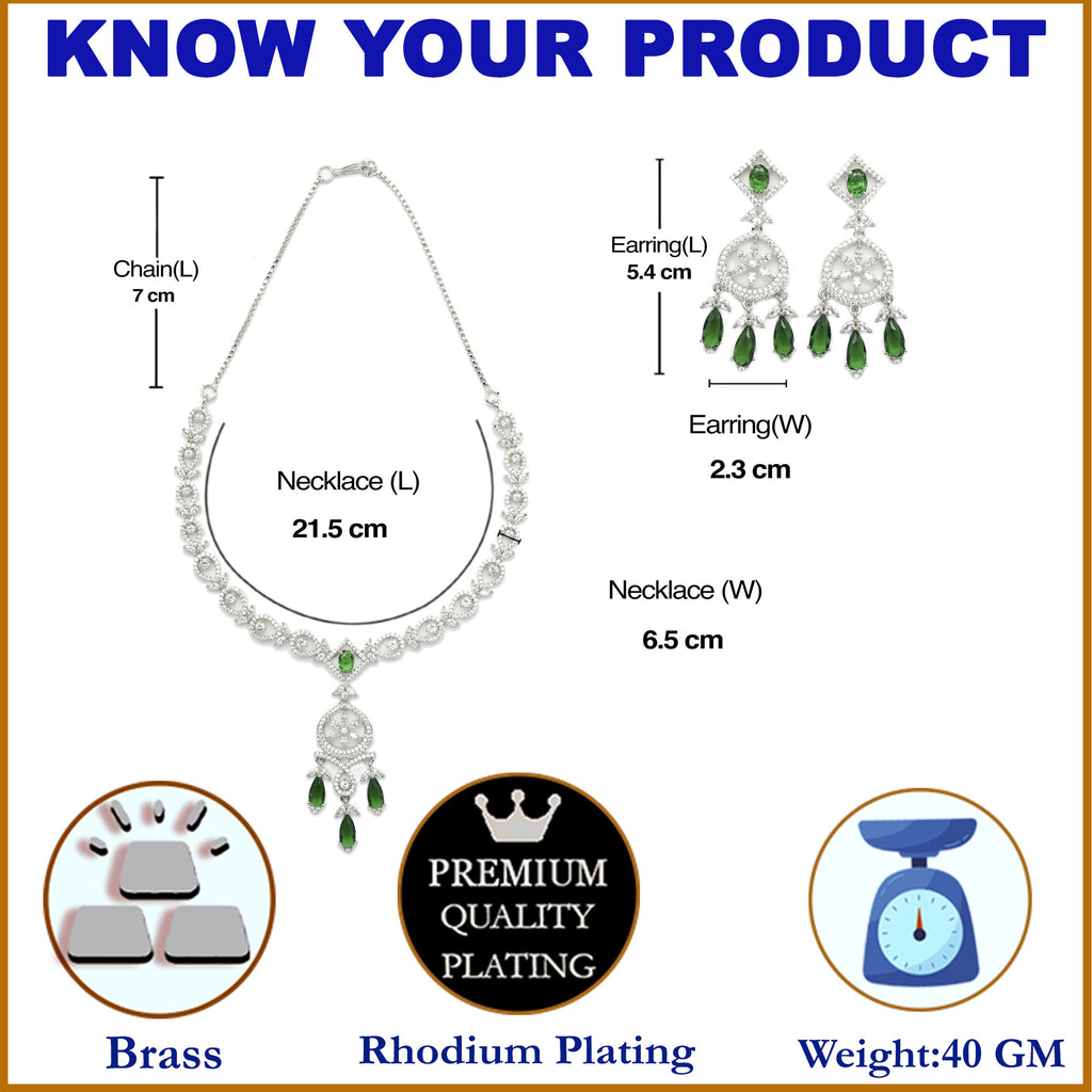 Rhodium-Plated Green Baguette Teardrops American Diamonds Studded Necklace & Earrings Jewellery Set