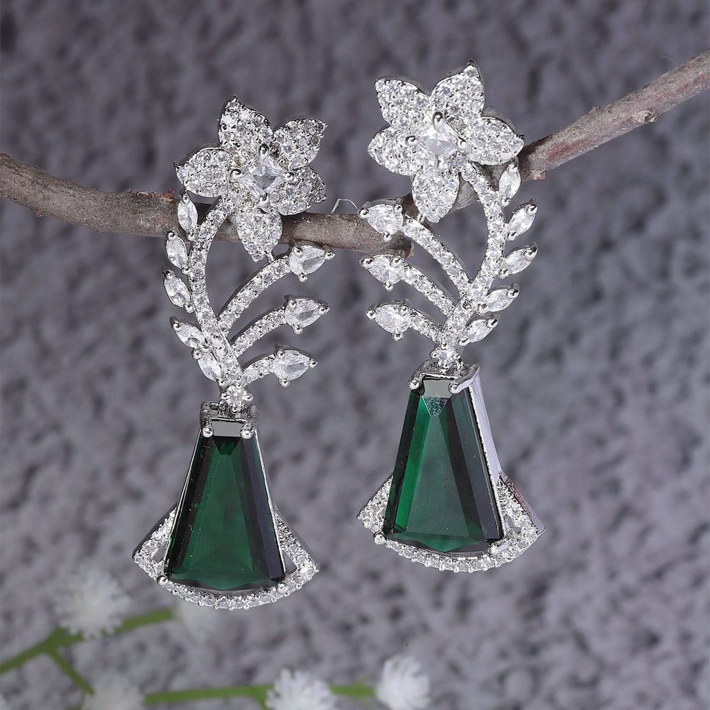 Rhodium-Plated Green & White American Diamond studded Floral Theme Drop Earrings
