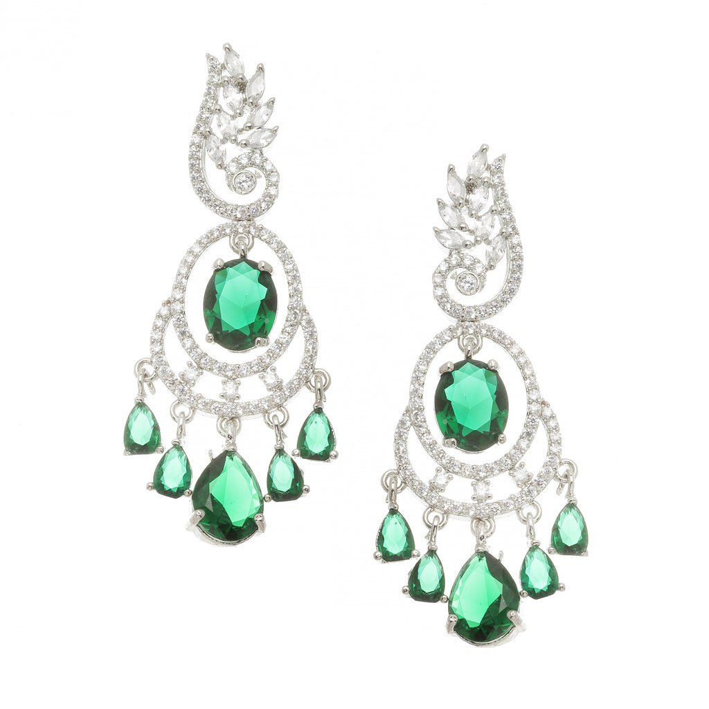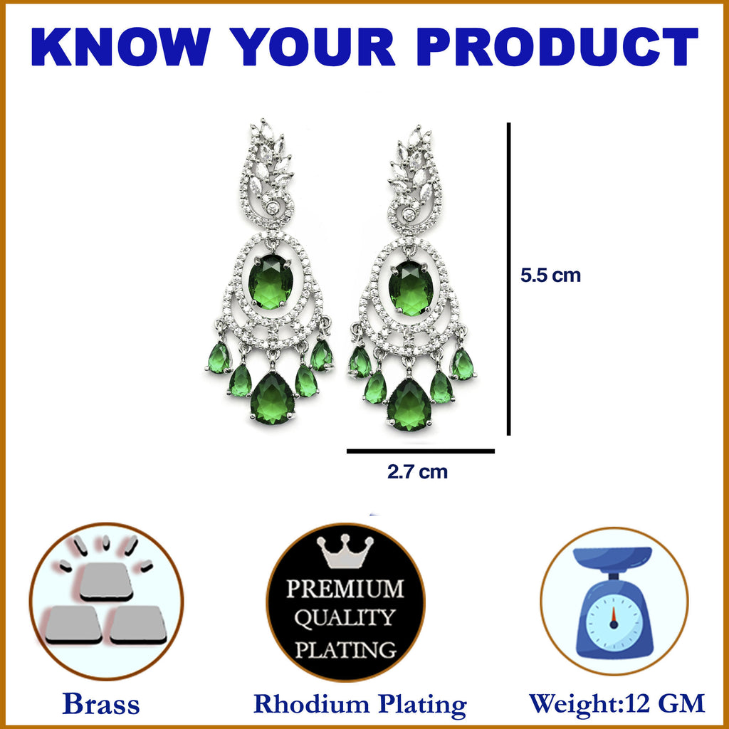 Rhodium-Plated Green & White American Diamond studded Oval & Leaf Shaped Drop Earrings