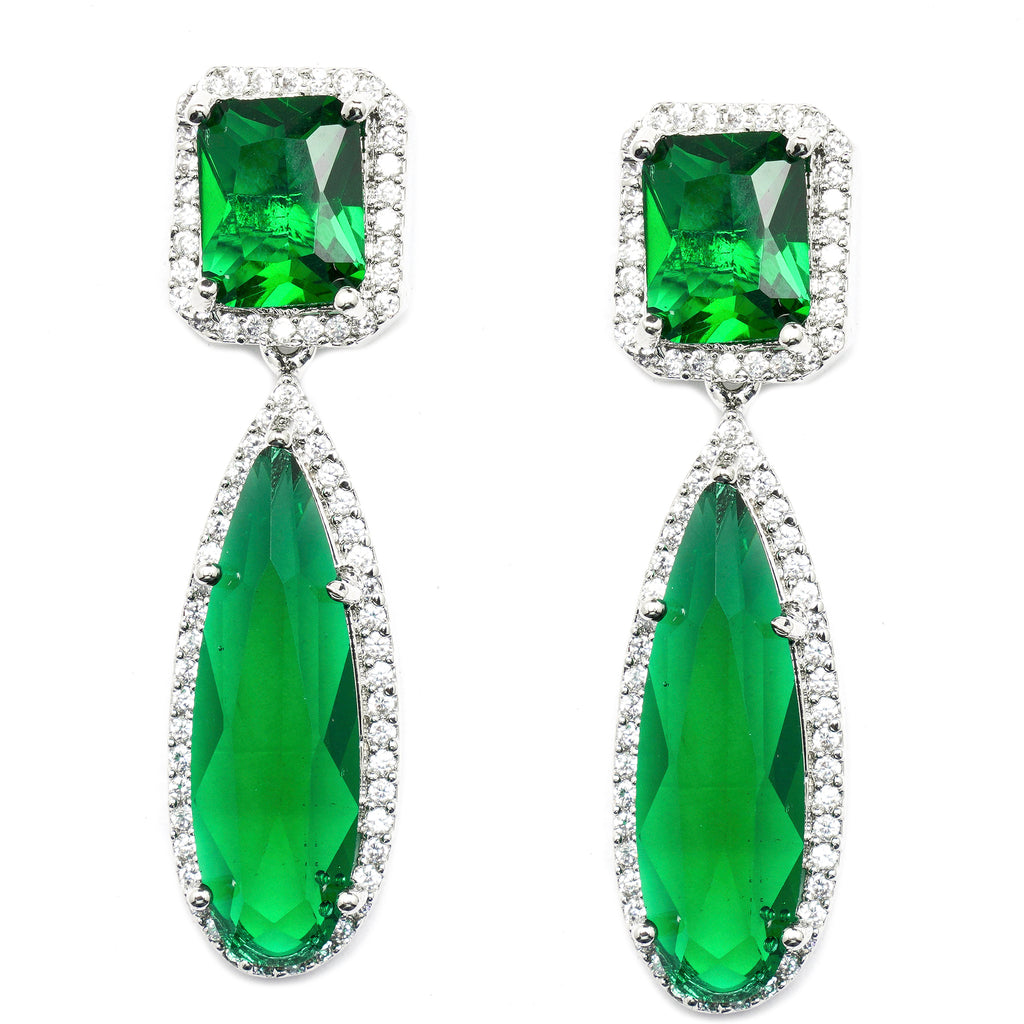 Rhodium-Plated Green & White Teardrop Shaped Drop Earrings, has American Diamond studded secured with a post and back.