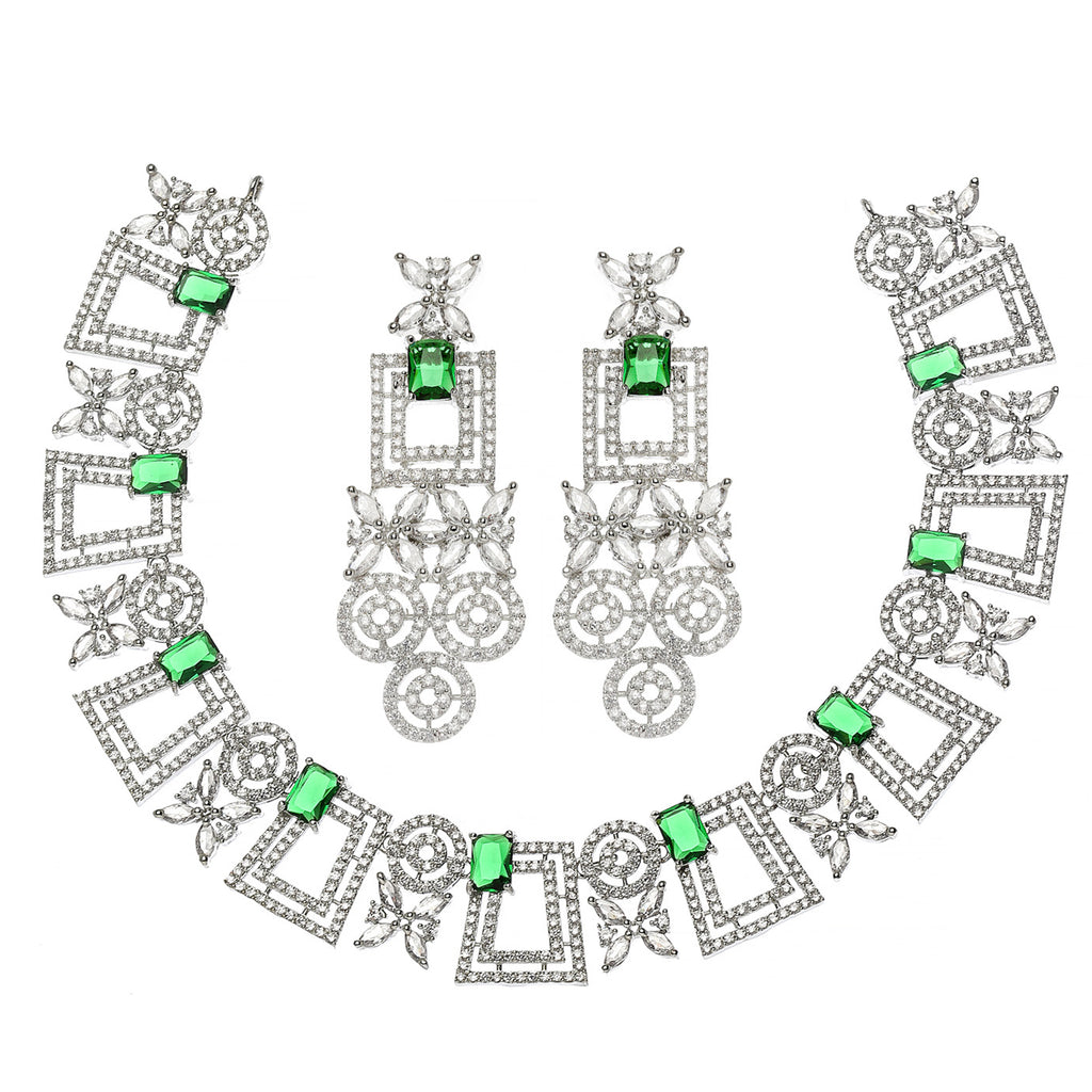 Rhodium-Plated Green & White American Diamonds Studded Squarish Shaped Necklace & Earrings Jewellery Set