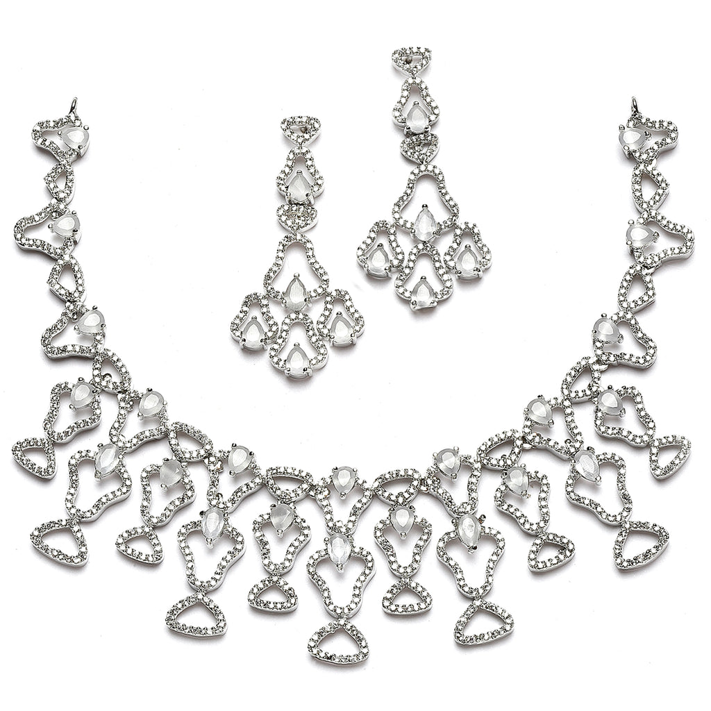 Rhodium-Plated Grey American Diamond Studded Quirky Design Necklace with Earrings Jewellery Set