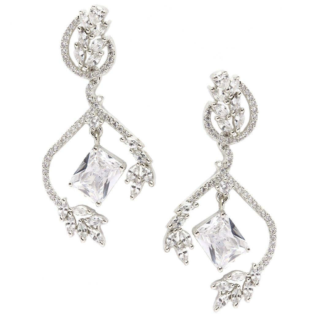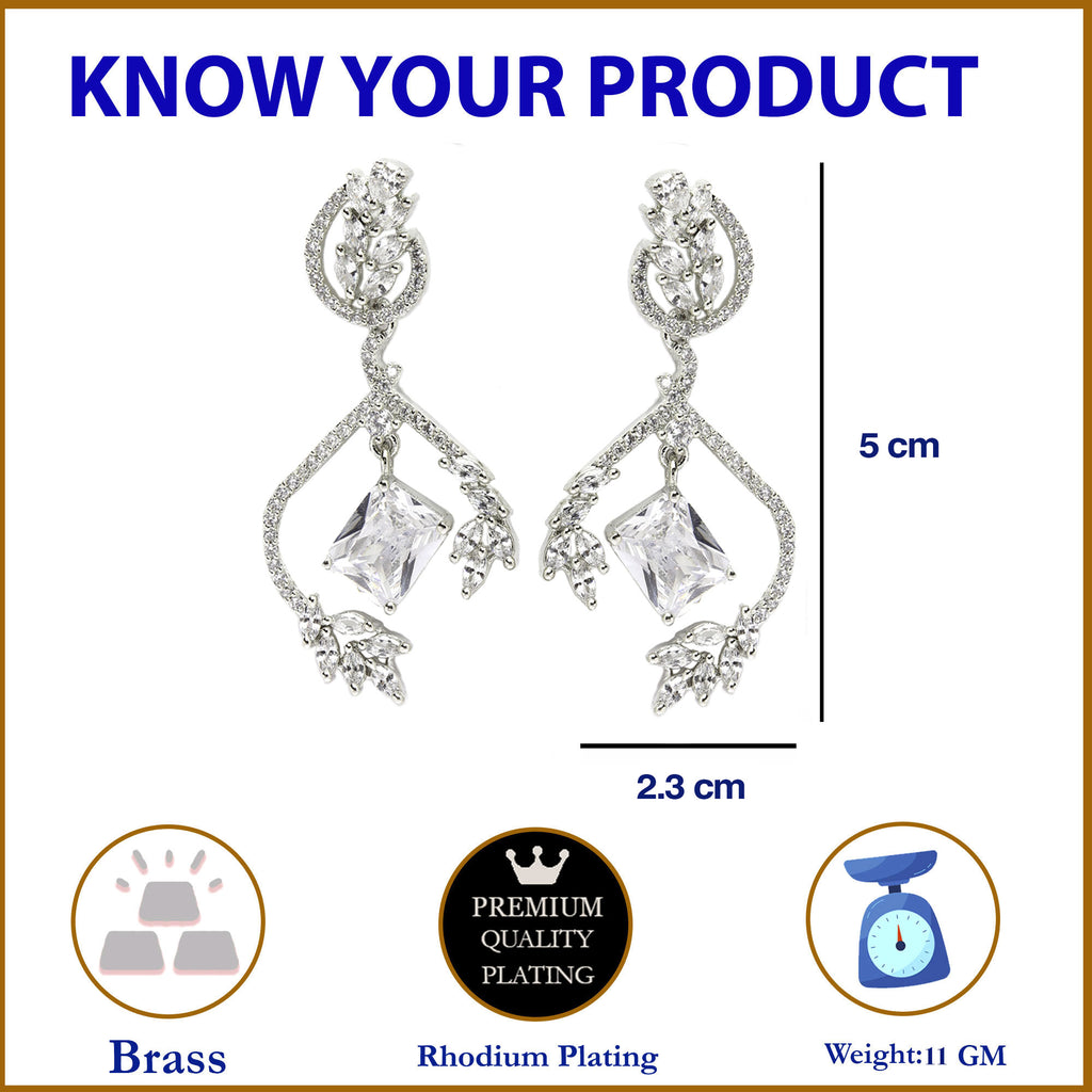 Rhodium-Plated White American Diamond studded Square & Leaf Shaped Drop Earrings