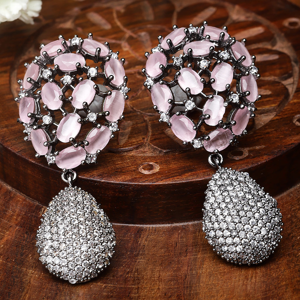Rhodium-Plated with Gunmetal Toned teardrop shape drop earrings, has Pink American Diamond studded secured with a post and back.