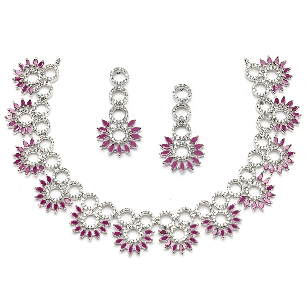 Rhodium-Plated Magenta American Diamond Studded Classic Necklace with Earrings Jewellery Set