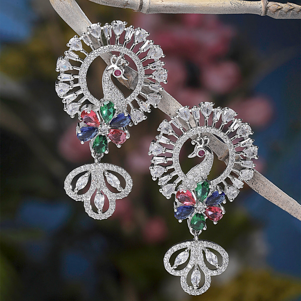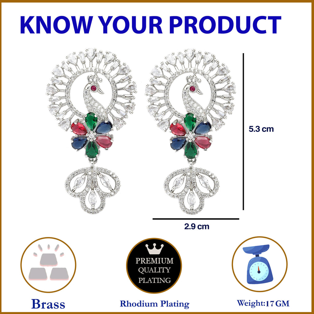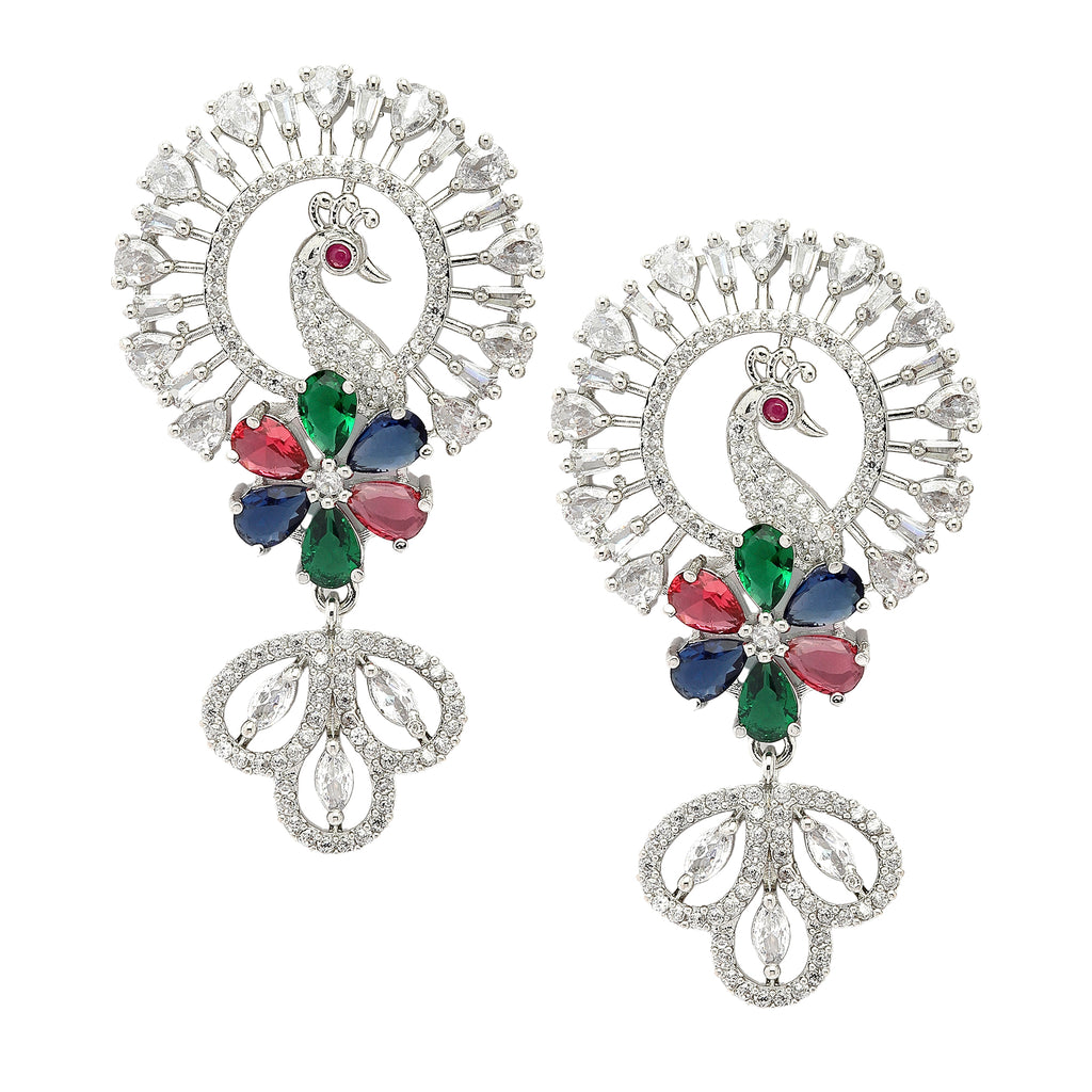 Rhodium-Plated Multi-Colour American Diamond studded Handcrafted Peacock Shaped Drop Earrings