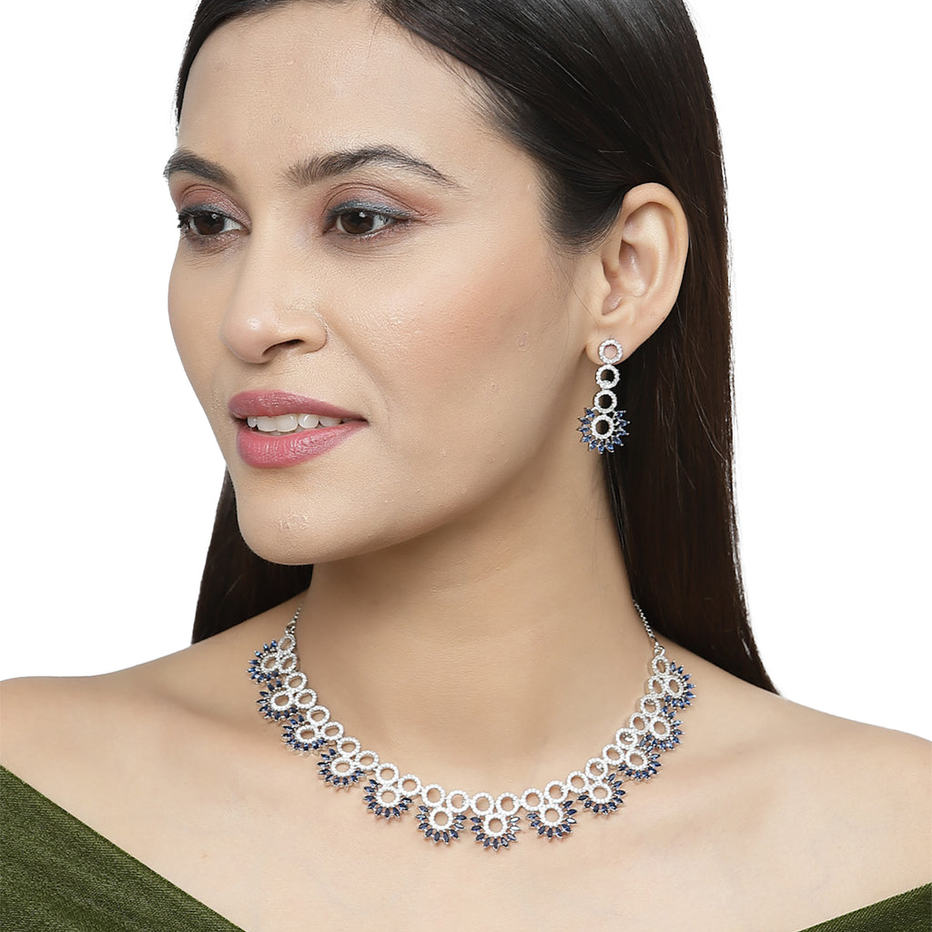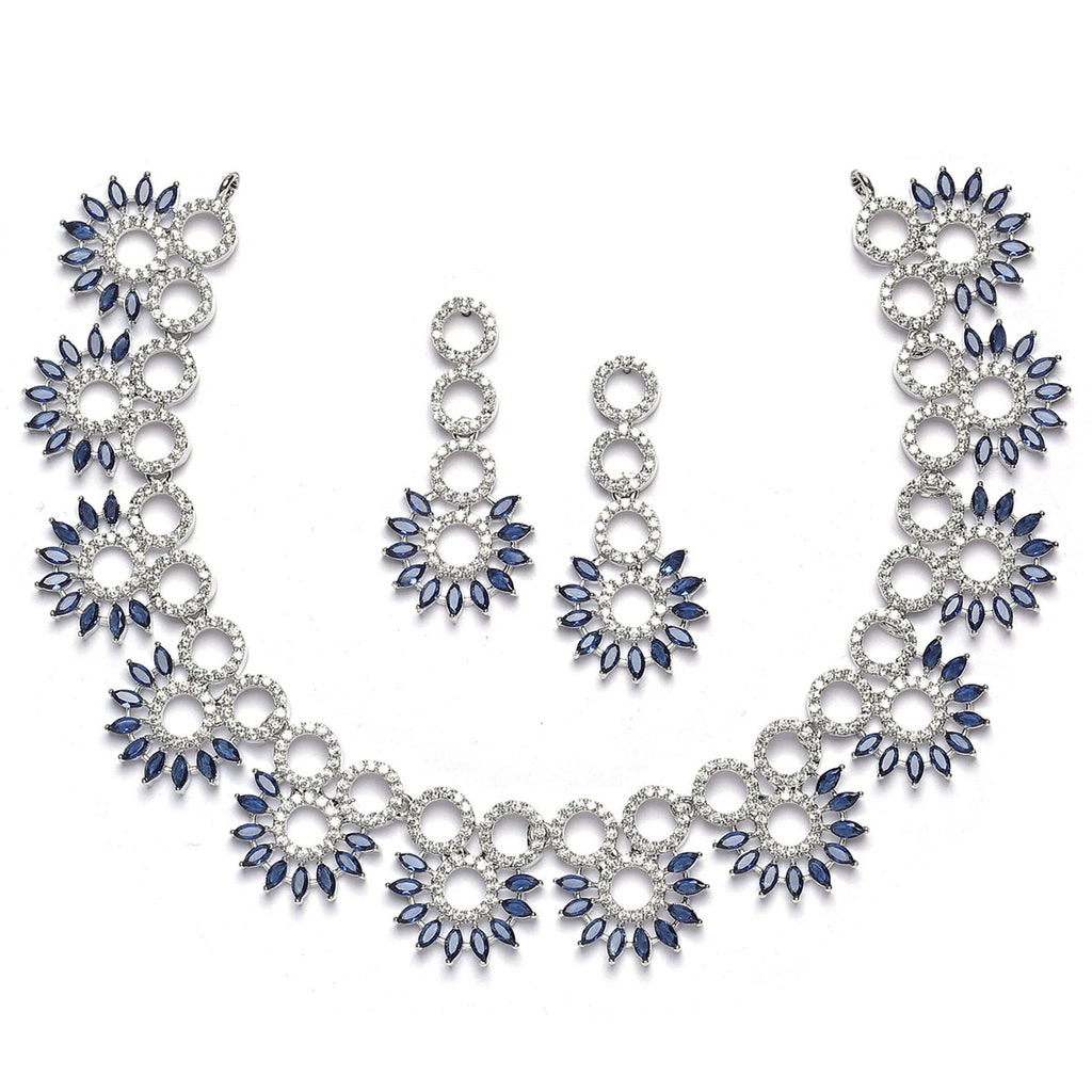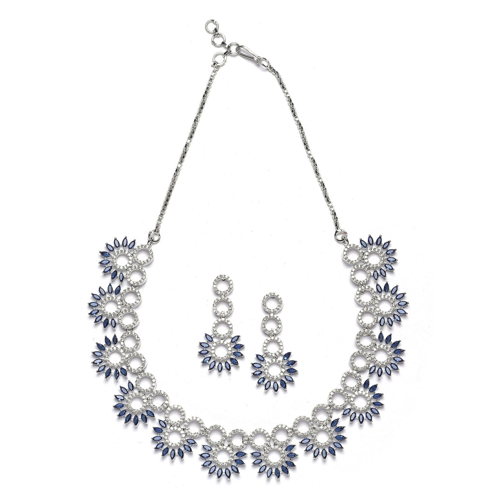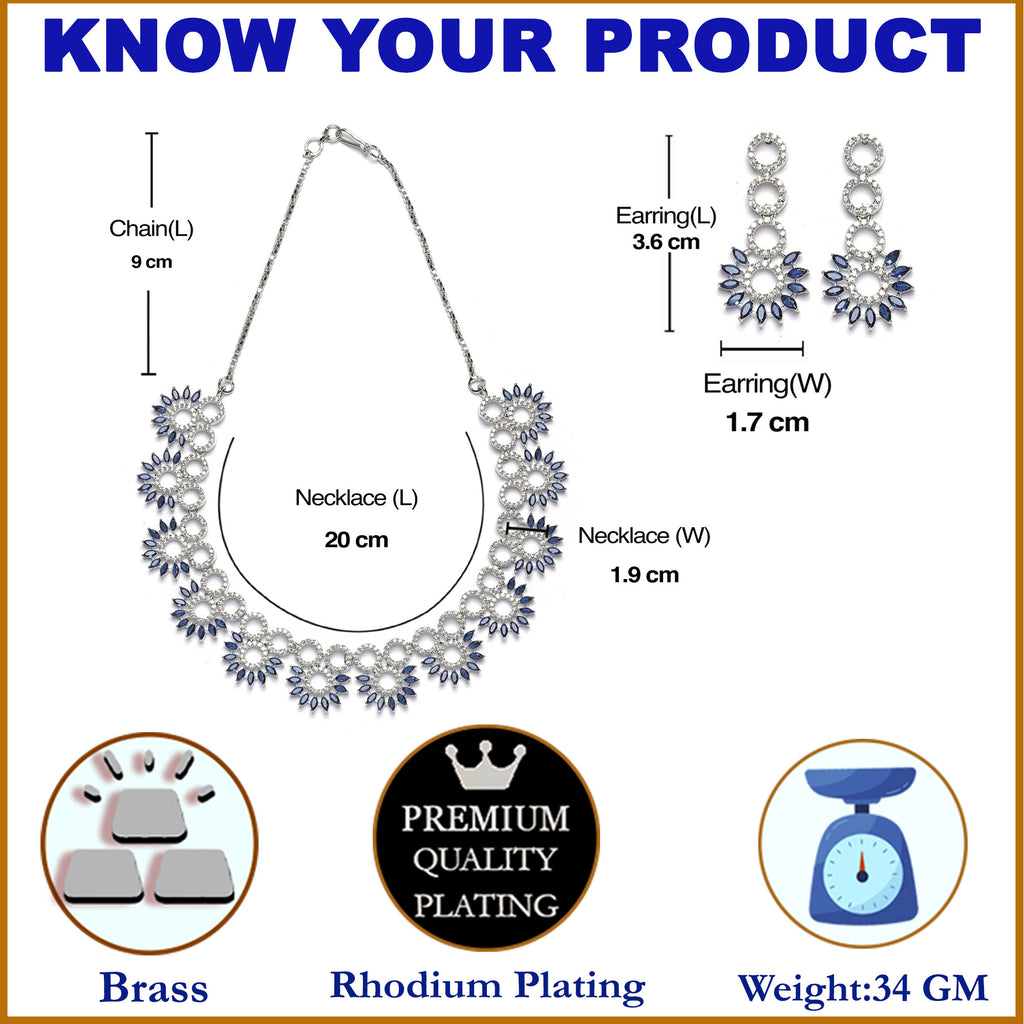 Rhodium-Plated Navy Blue American Diamond Studded Classic Necklace with Earrings Jewellery Set