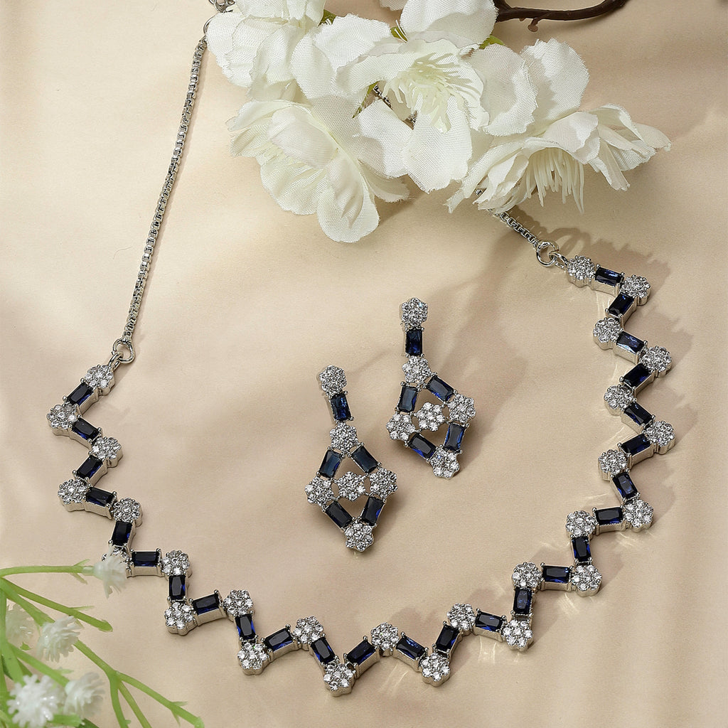 Rhodium-Plated Navy Blue American Diamond Studded Necklace With Earrings Jewellery Set