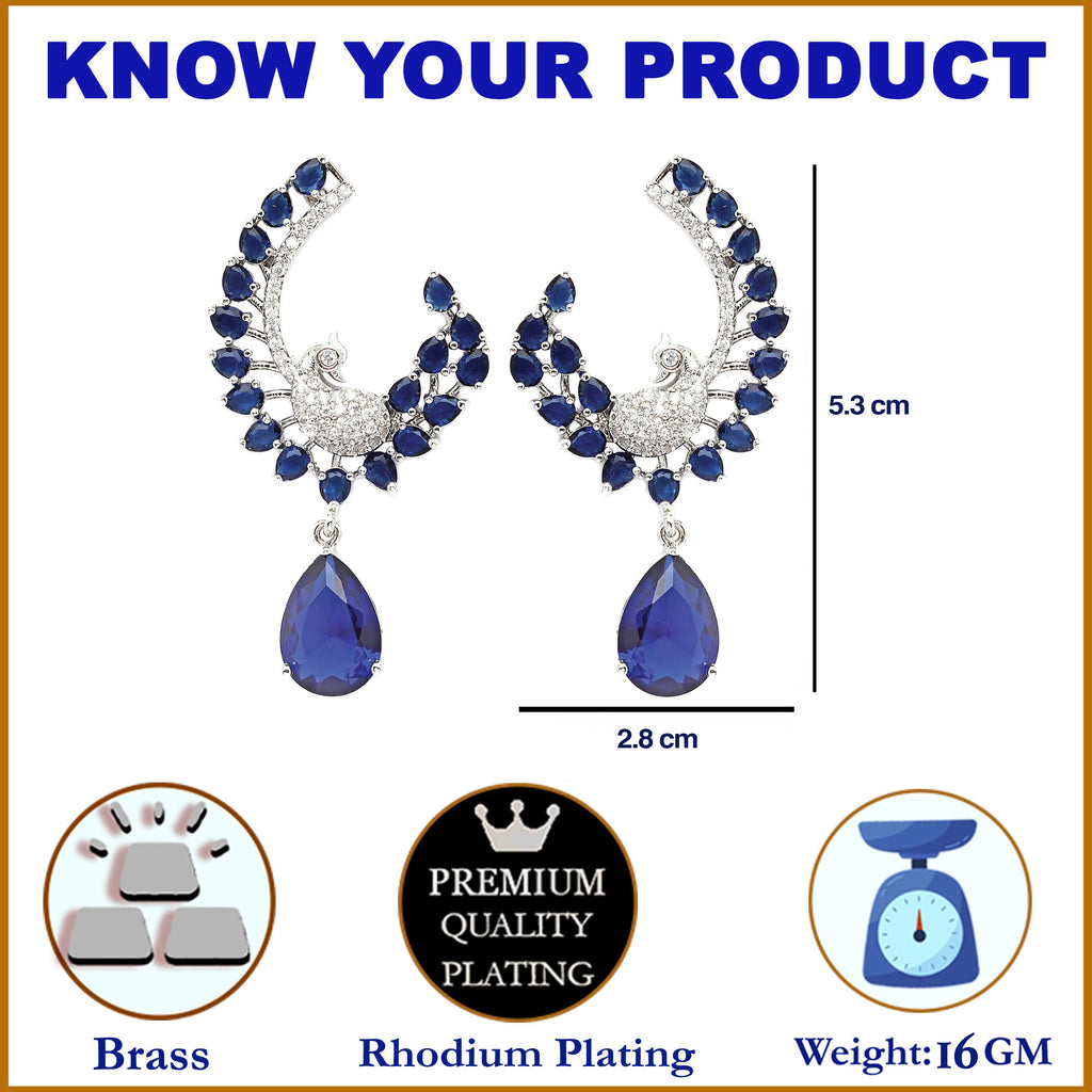 Rhodium-Plated Navy Blue American Diamond studded Peacock & Feather Shaped Drop Earrings