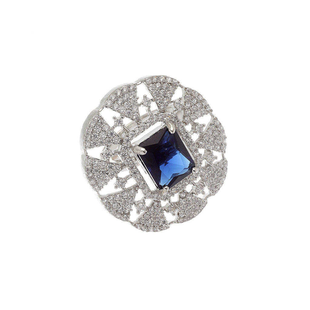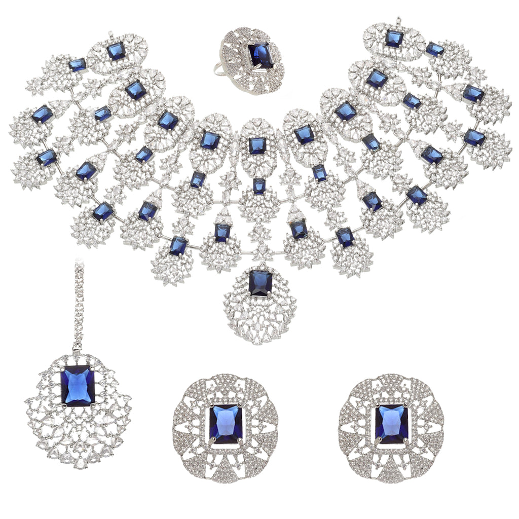 This jewellery set consists of a necklace, a pair of earrings, a ring and a maangtikka. Rhodium-Plated navy blue & white american diamond studded tasselled necklace, has secured with a hook closure. A pair of matching stud earrings, each secured with a post and back closure. A mataching ring, secured with adjustable closure. A matching maangtikka, secured with hook closure.
