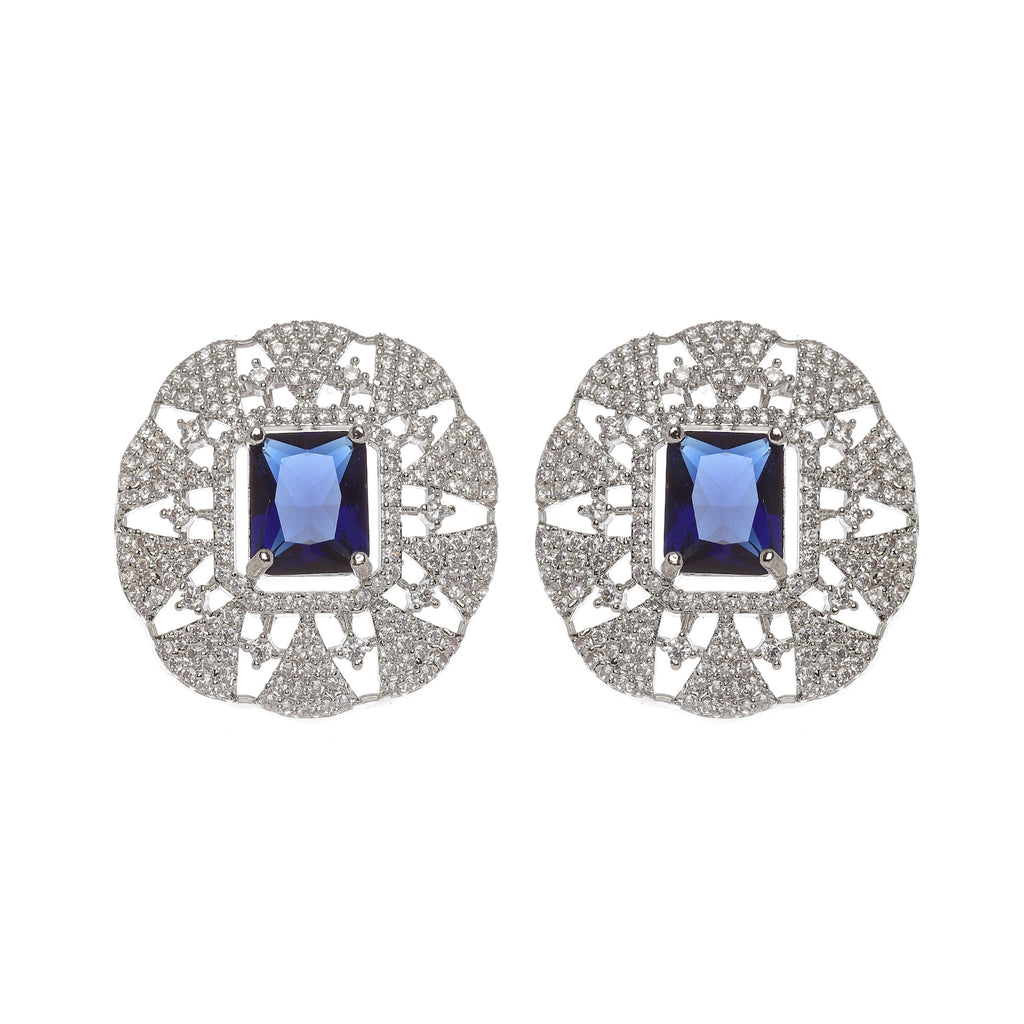 Rhodium-Plated Navy Blue American Diamond Studded Tasselled Jewellery Set