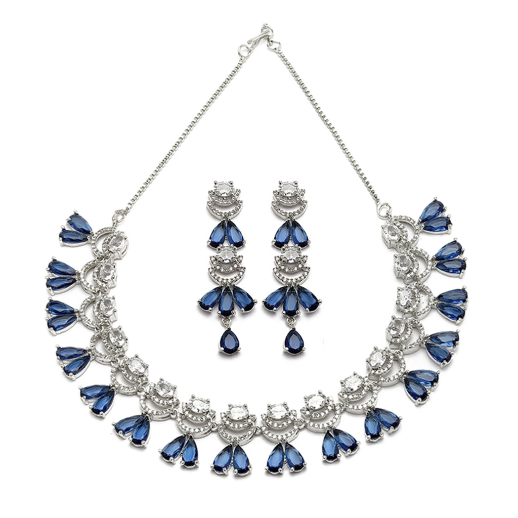 Rhodium-Plated Navy Blue American Diamond Studded Teardrop & Crescent Shaped Necklace with Earrings Jewellery Set