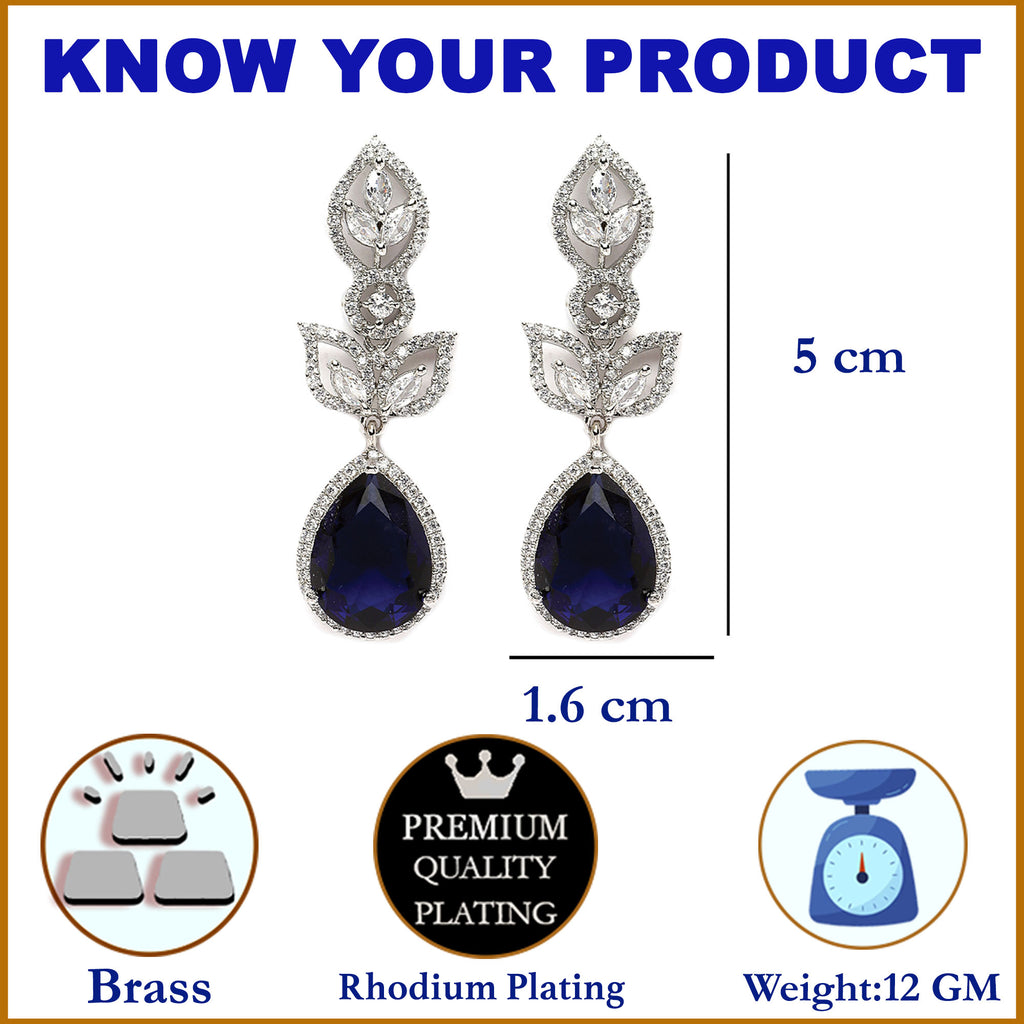 Rhodium-Plated with Silver-Toned Navy Blue & White Teardrop & Leaf Shaped Drop Earrings, has American Diamond studded secured with a post and back.