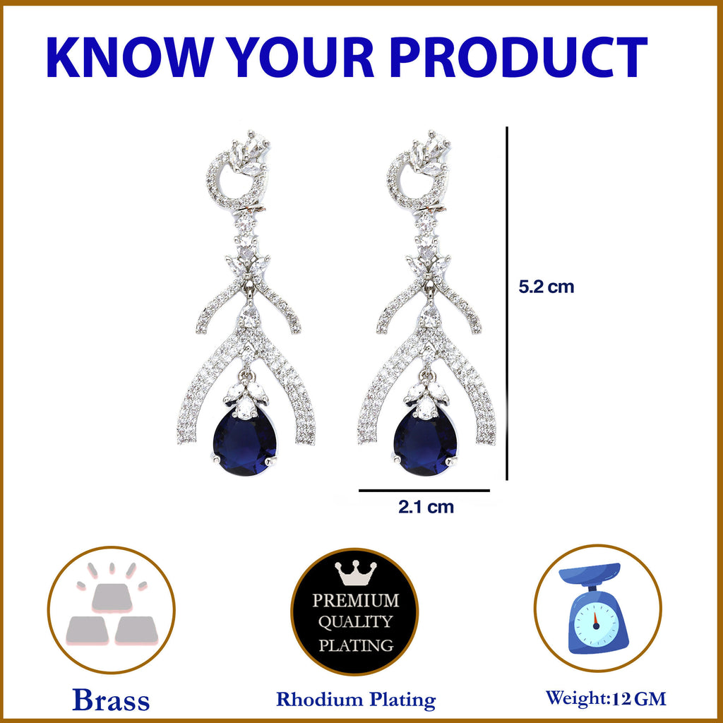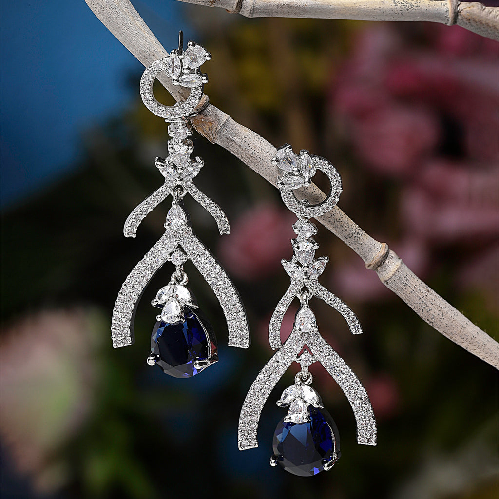 Rhodium-Plated Navy Blue American Diamond studded Teardrop & Quirky Shaped Drop Earrings