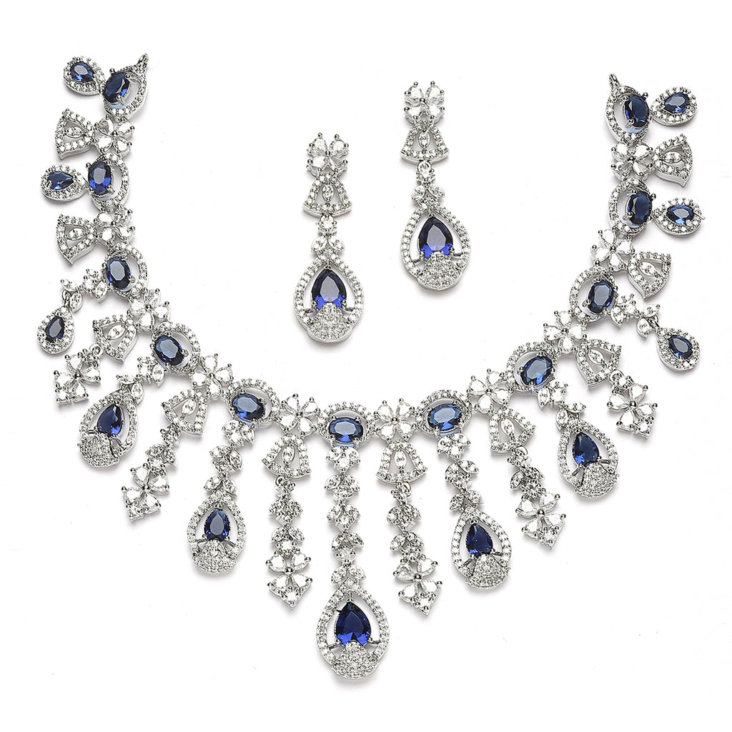 Rhodium-Plated Navy Blue American Diamond Studded Teardrop Tasselled Necklace & Earrings Jewellery Set