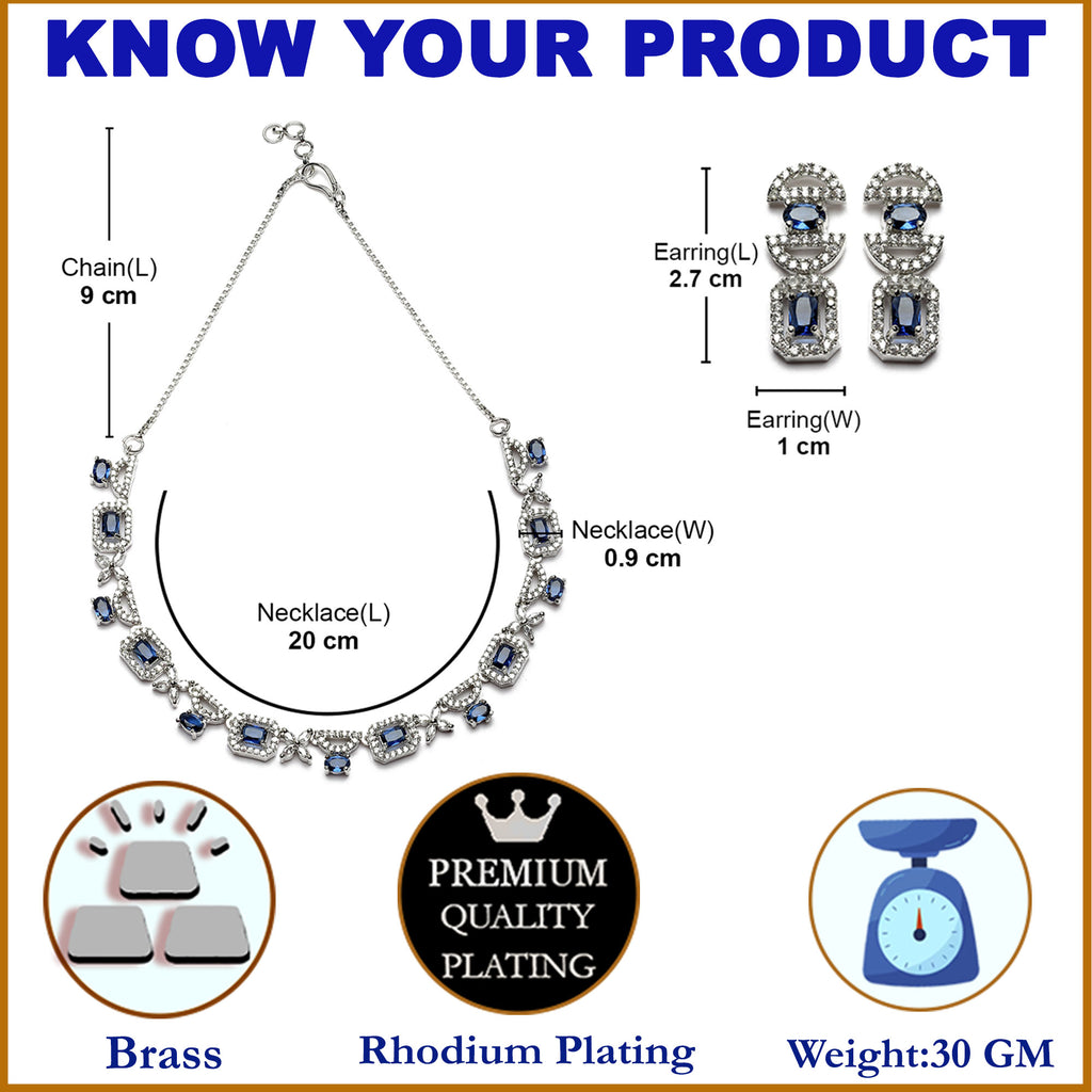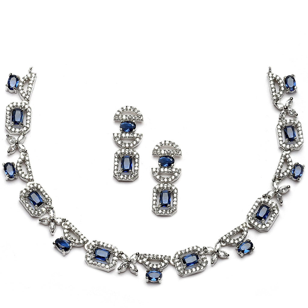 Rhodium-Plated Navy Blue American Diamonds Studded Boxy Necklace & Earrings Jewellery Set
