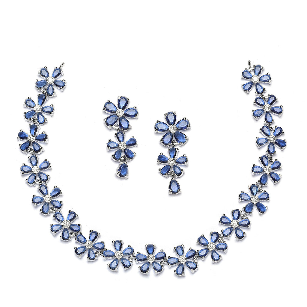 This jewellery set consists of a necklace and a pair of earrings. Rhodium-Plated navy blue american diamonds studded floral necklace, secured with s-hook closure. A pair of matching drop earrings, each secured with a post and back closure.