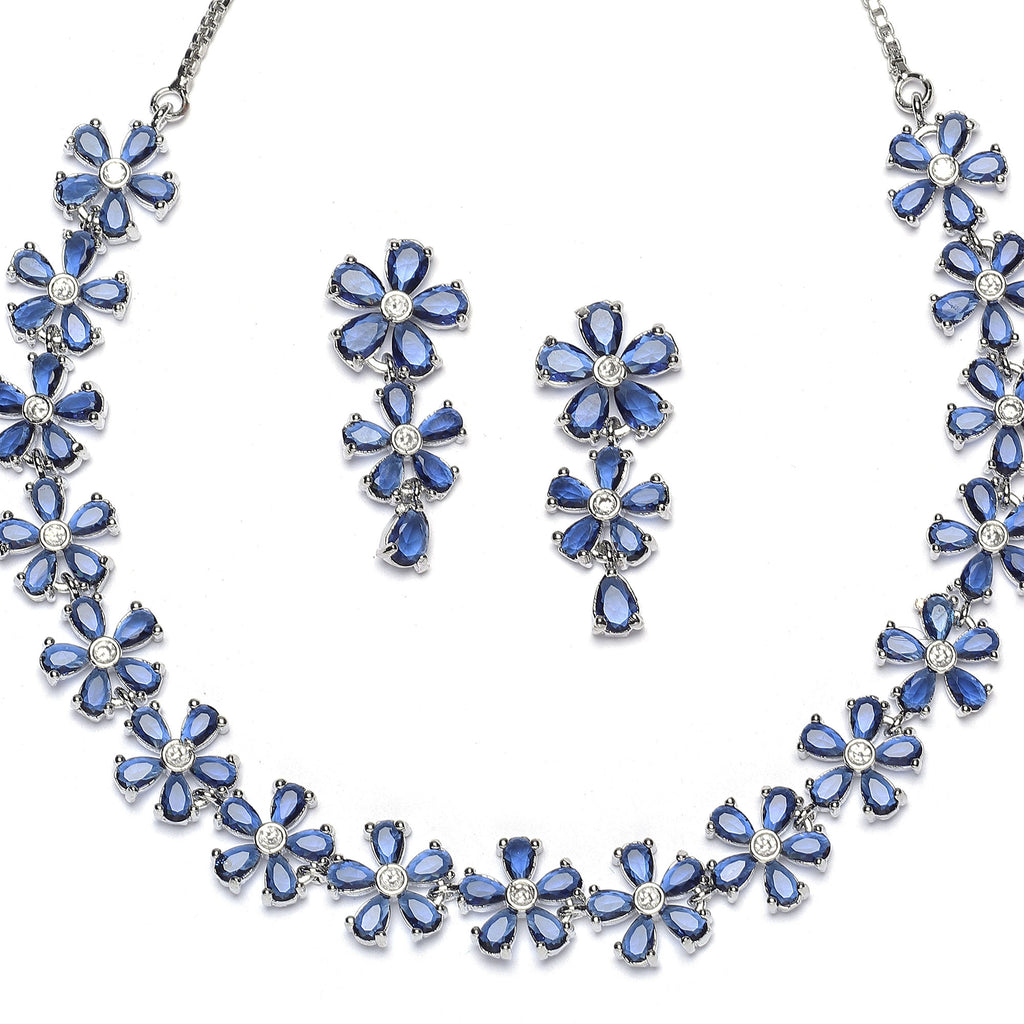 Rhodium-Plated Navy Blue American Diamonds Studded Floral Necklace & Earrings Jewellery Set