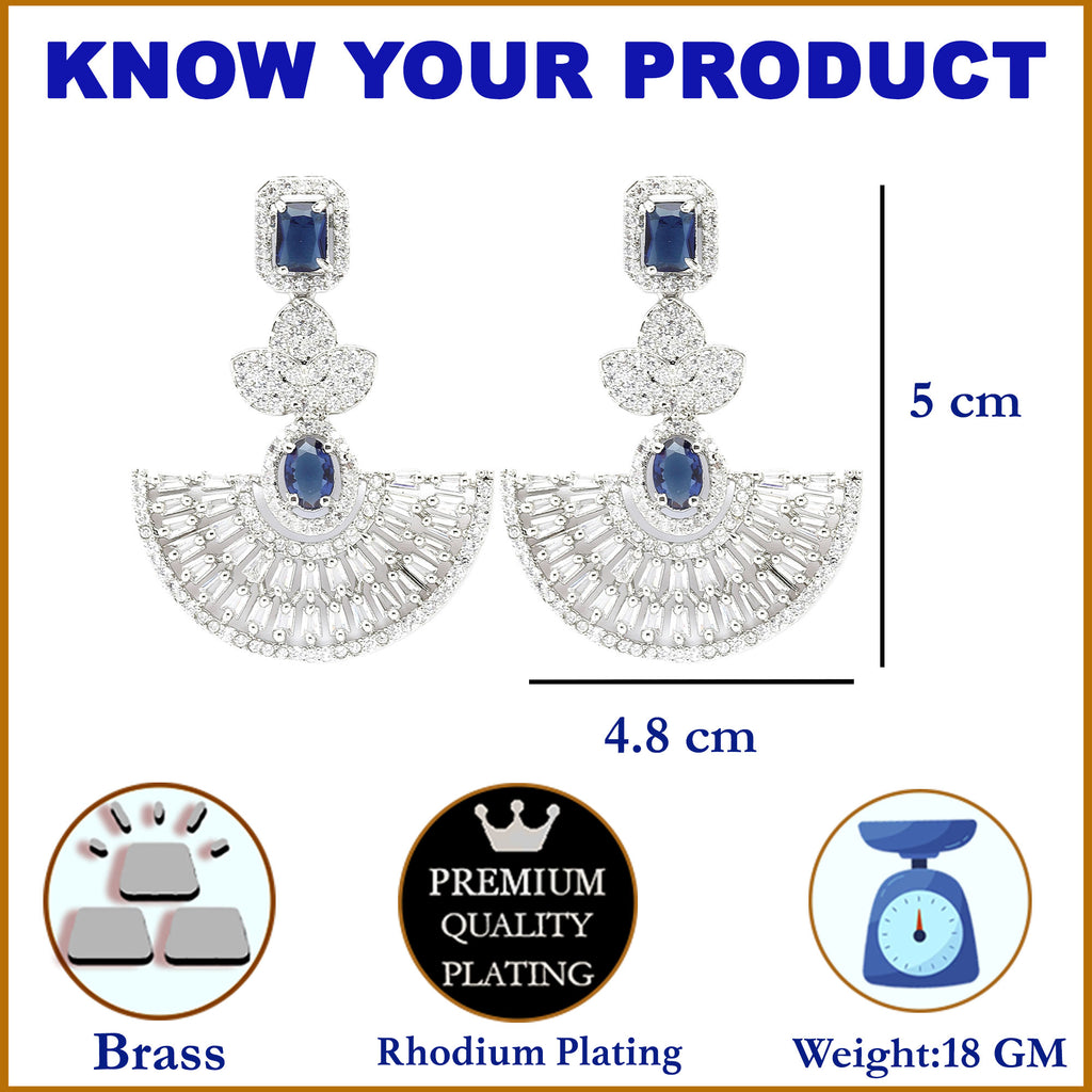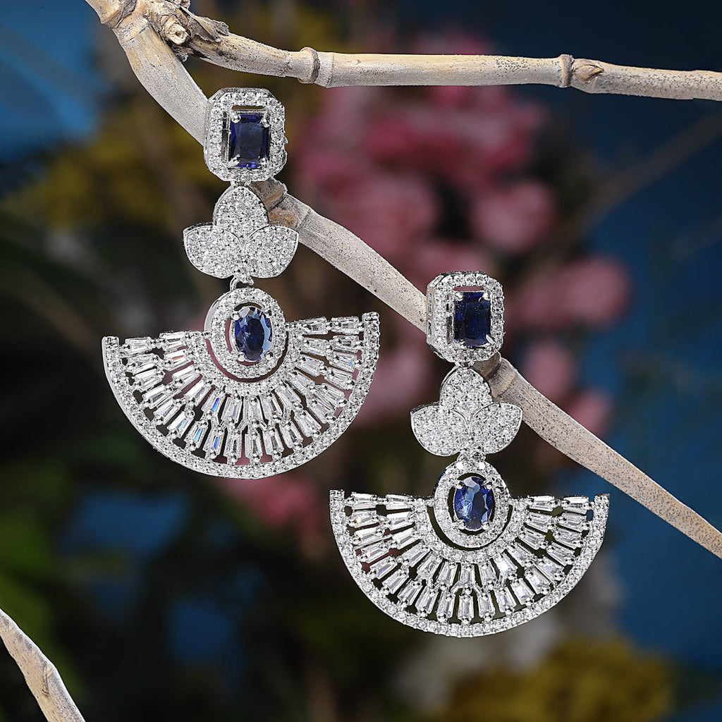 Rhodium-Plated Navy Blue & White American Diamond studded Leaf Shaped Drop Earrings