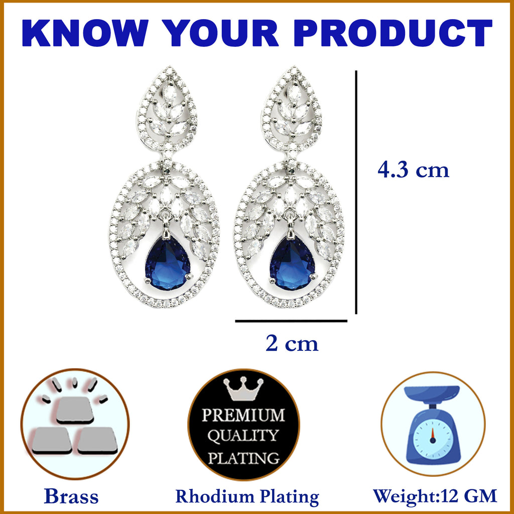 Rhodium-Plated Navy Blue & White American Diamond studded Oval Shaped Drop Earrings