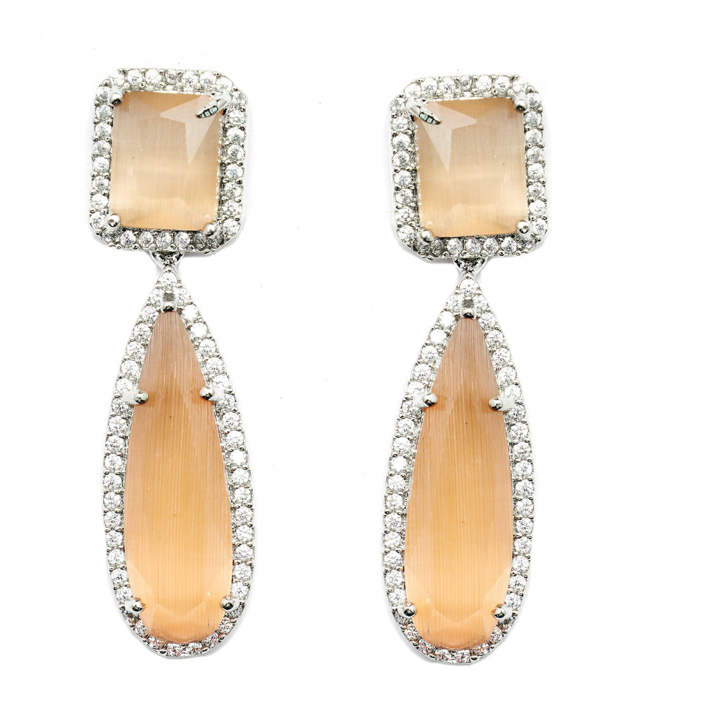 Rhodium-Plated Orange & White Teardrop Shaped Drop Earrings, has American Diamond studded secured with a post and back.