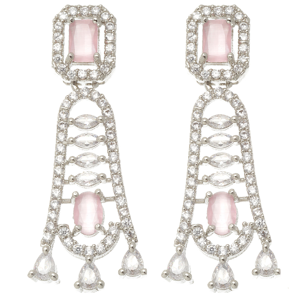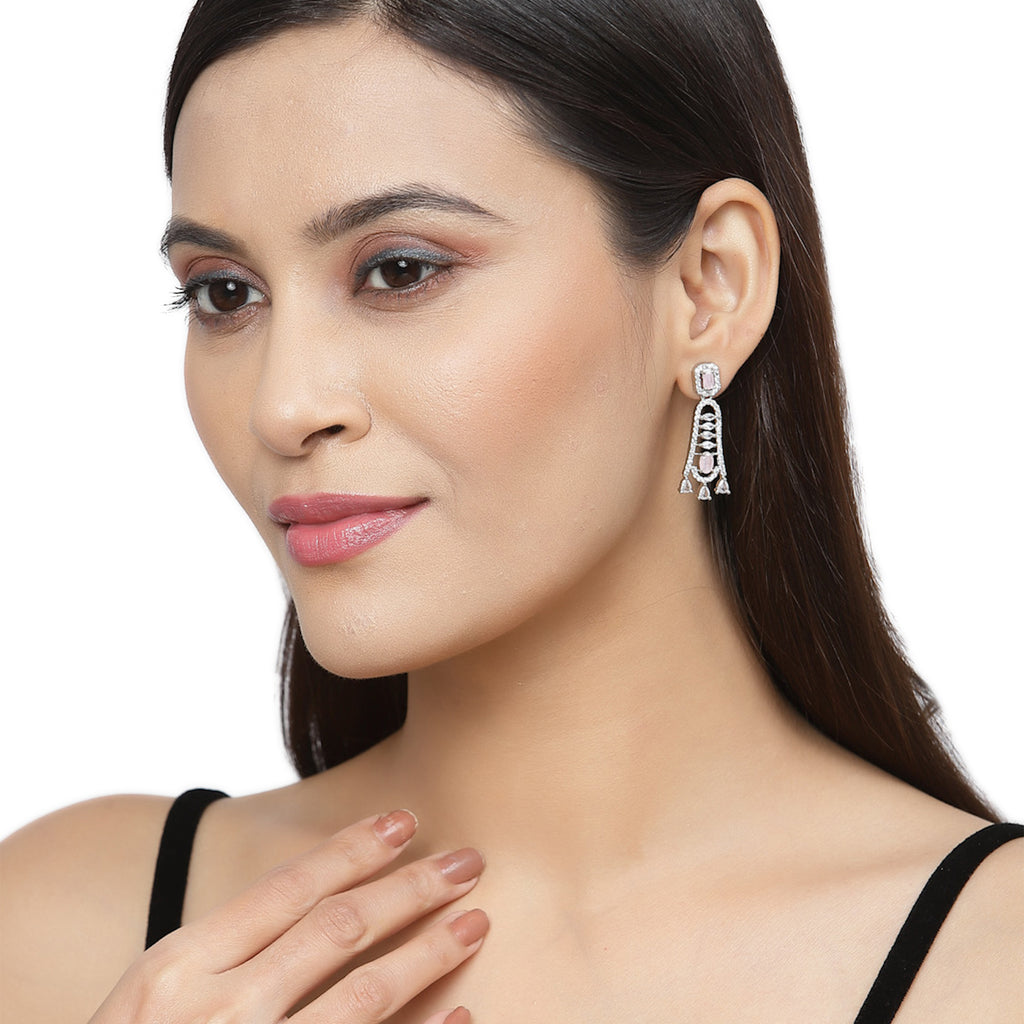 Rhodium-Plated with Silver-Toned Pink and White Contemporary Drop Earrings, has American Diamond studded secured with a post and back.