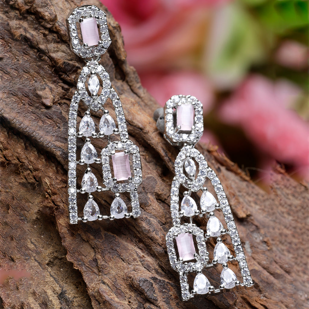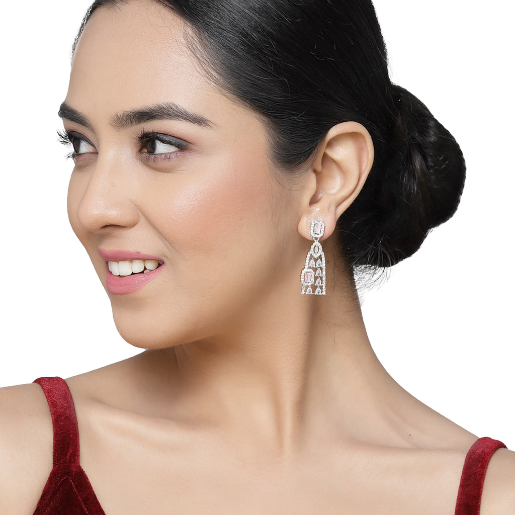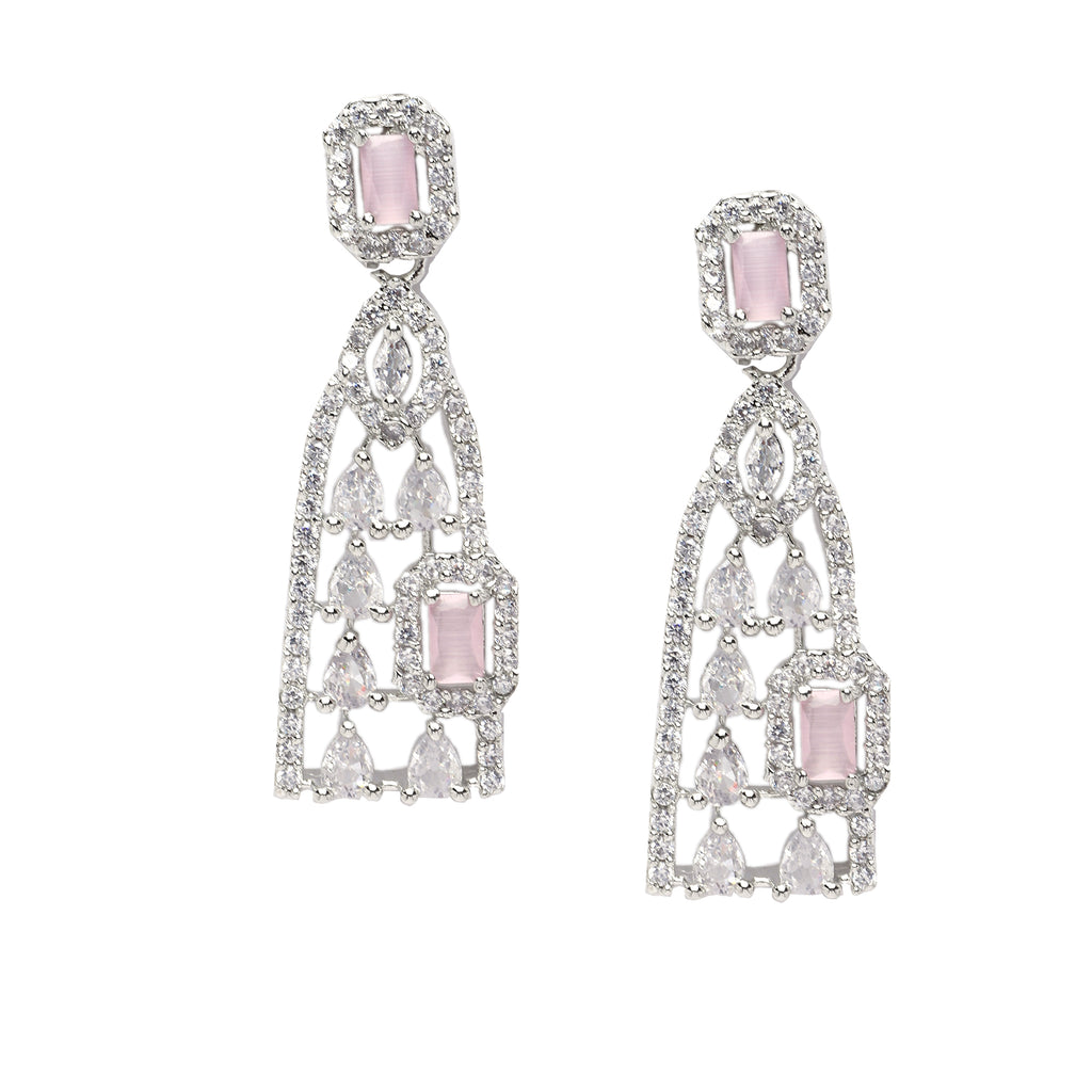 Rhodium-Plated with Silver-Toned Pink and White Classic Drop Earrings, has American Diamond studded secured with a post and back.