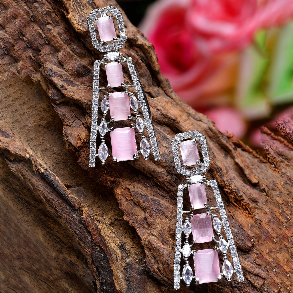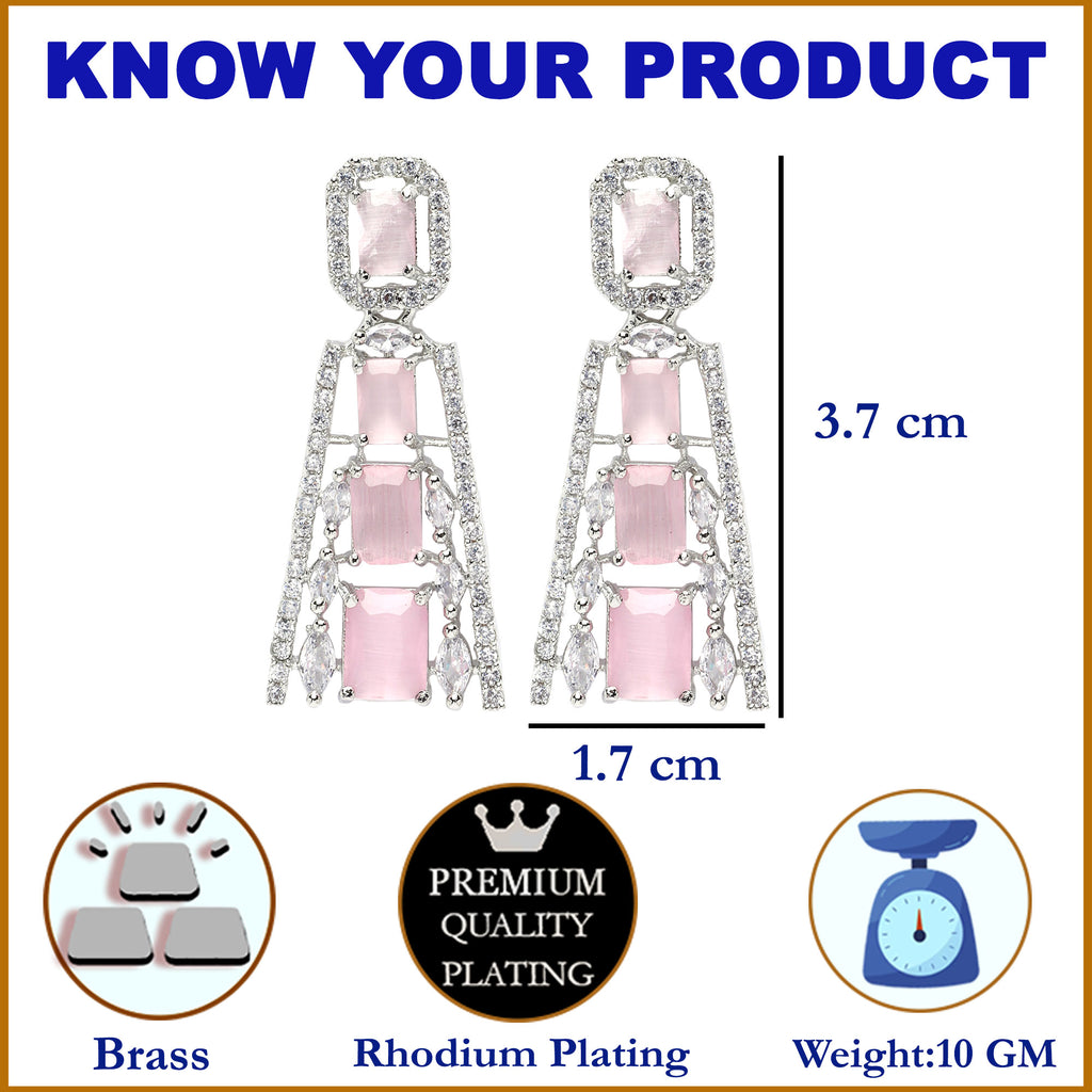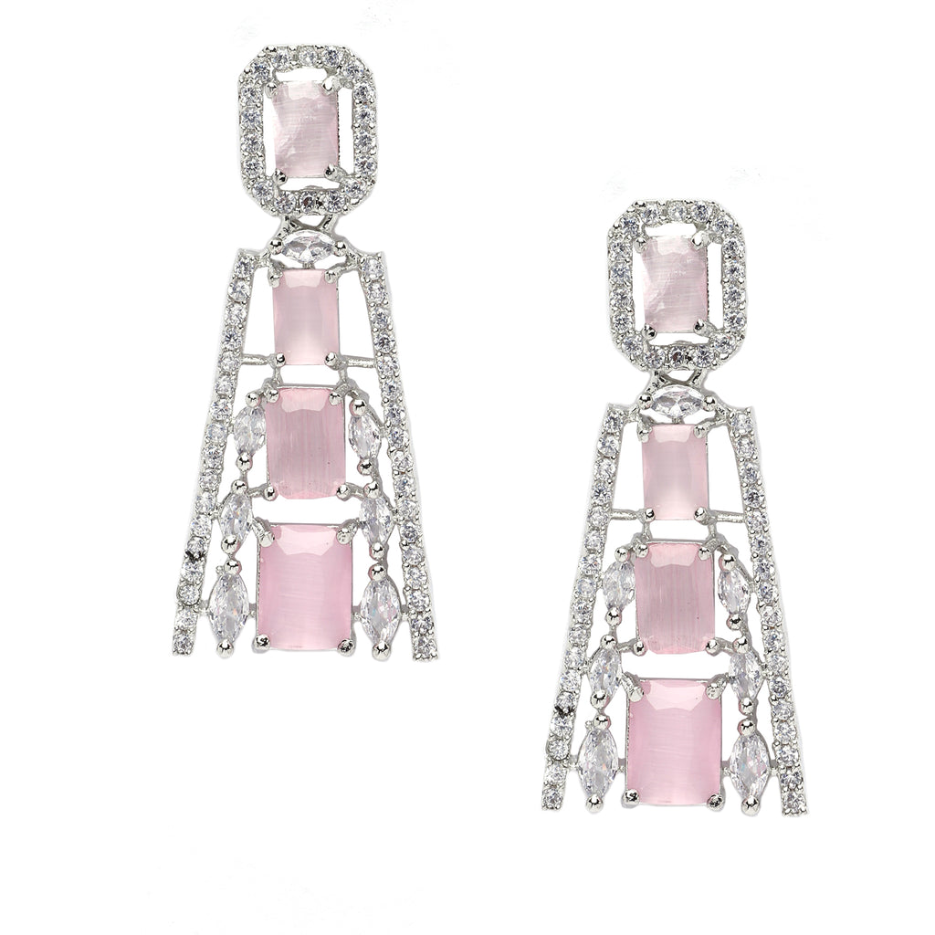 Rhodium-Plated with Silver-Toned Pink and White Contemporary Drop Earrings, has American Diamond studded secured with a post and back.
