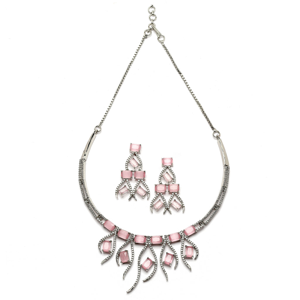 Rhodium-Plated Pink American Diamond Studded Contemporary Necklace with Earrings Jewellery Set